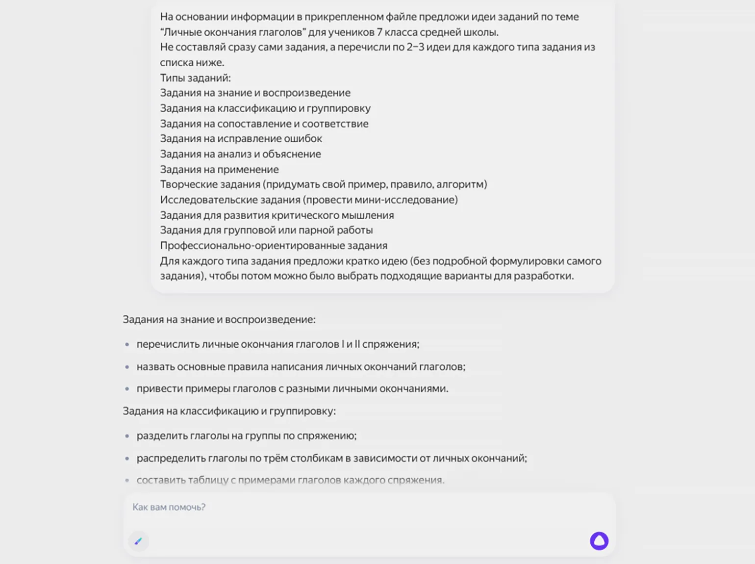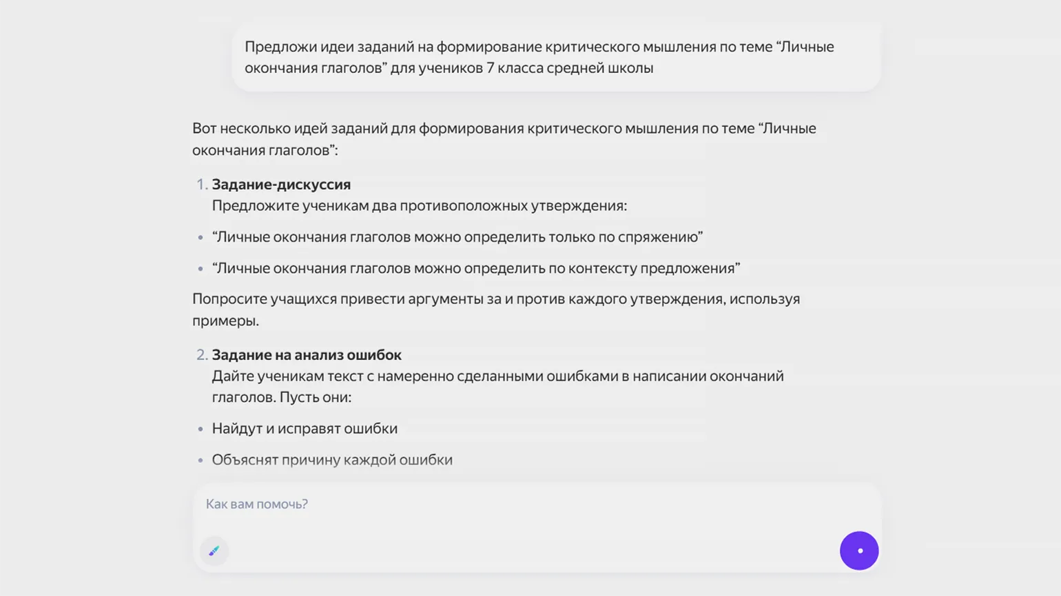 Для этого можно использовать следующий несложный промпт: «Предложи идеи заданий на формирование критического мышления по теме „Личные окончания глаголов“ для учеников 7-го класса средней школы».