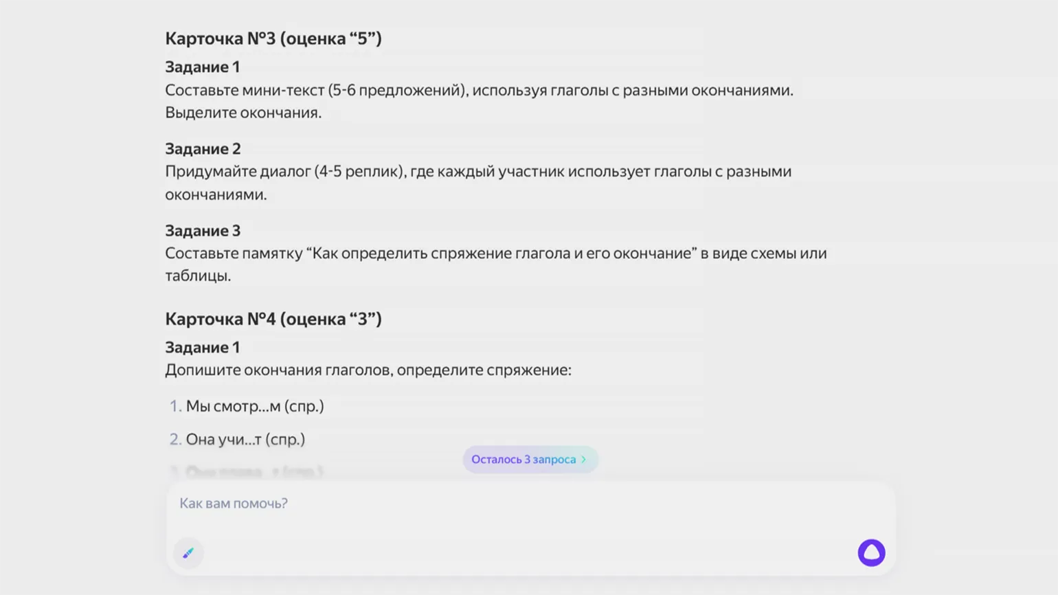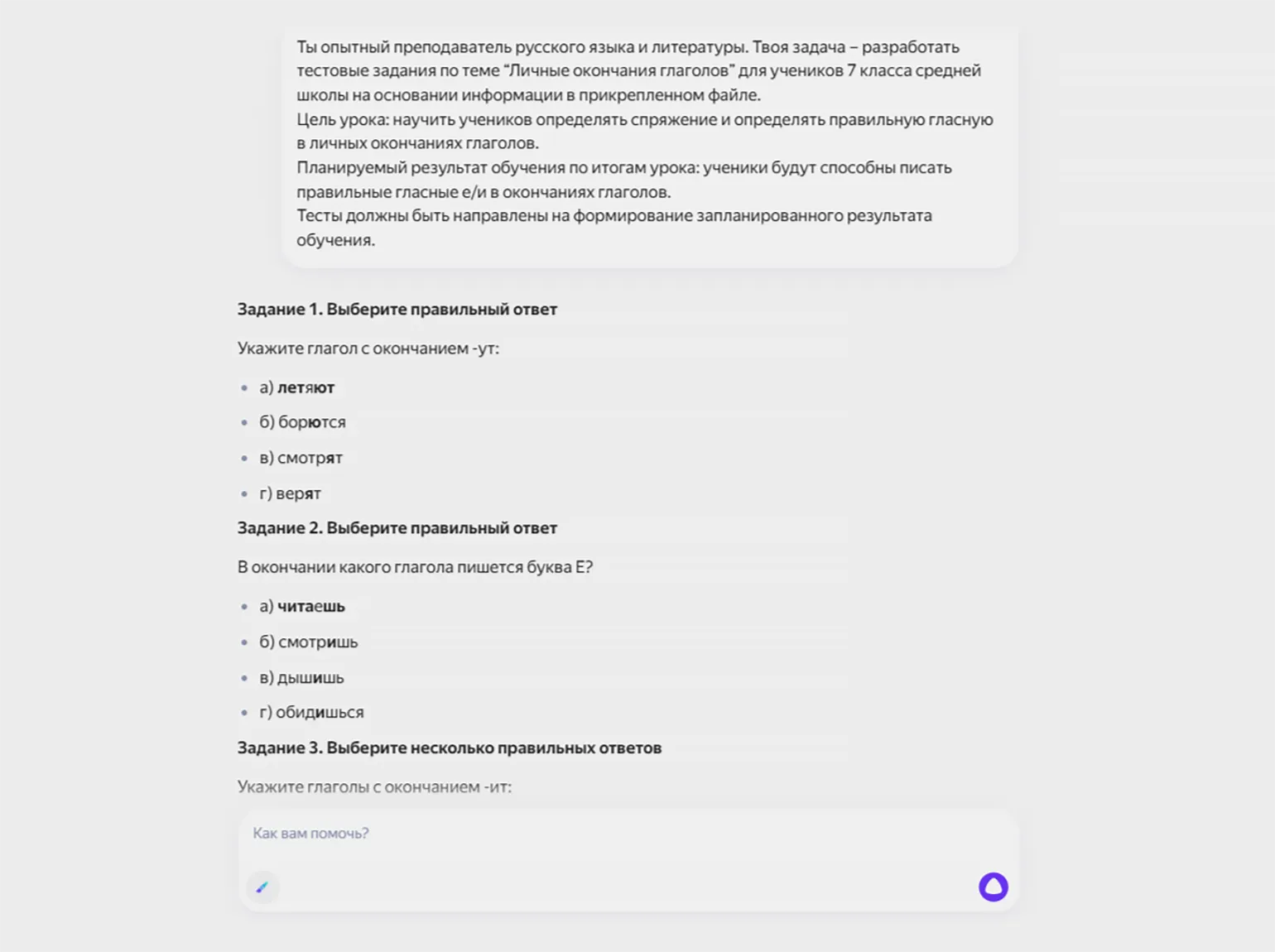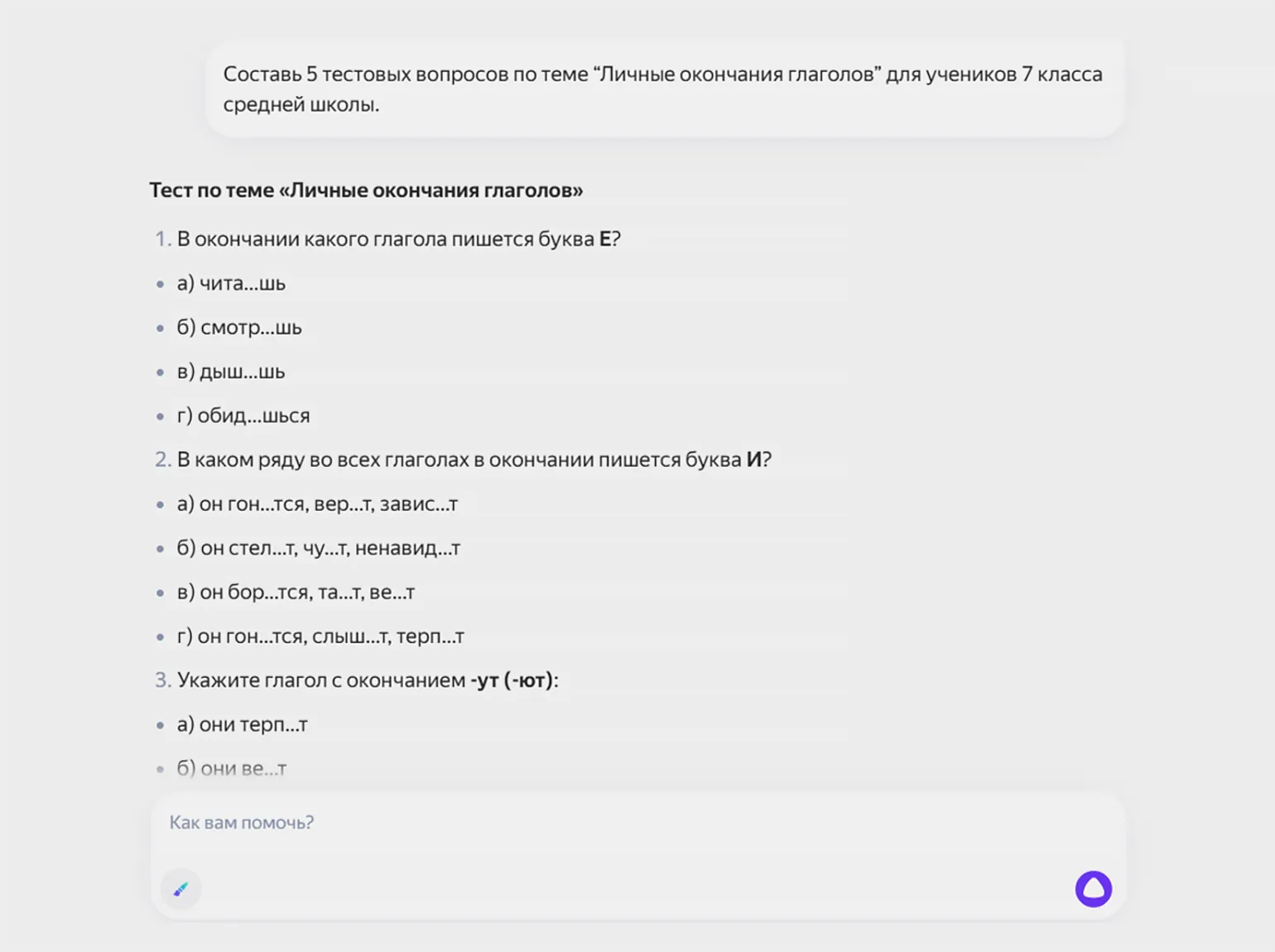 Допустим, вы предлагаете нейросети такой запрос: «Составь 5 тестовых вопросов по теме „Личные окончания глаголов“ для учеников 7-го класса средней школы».