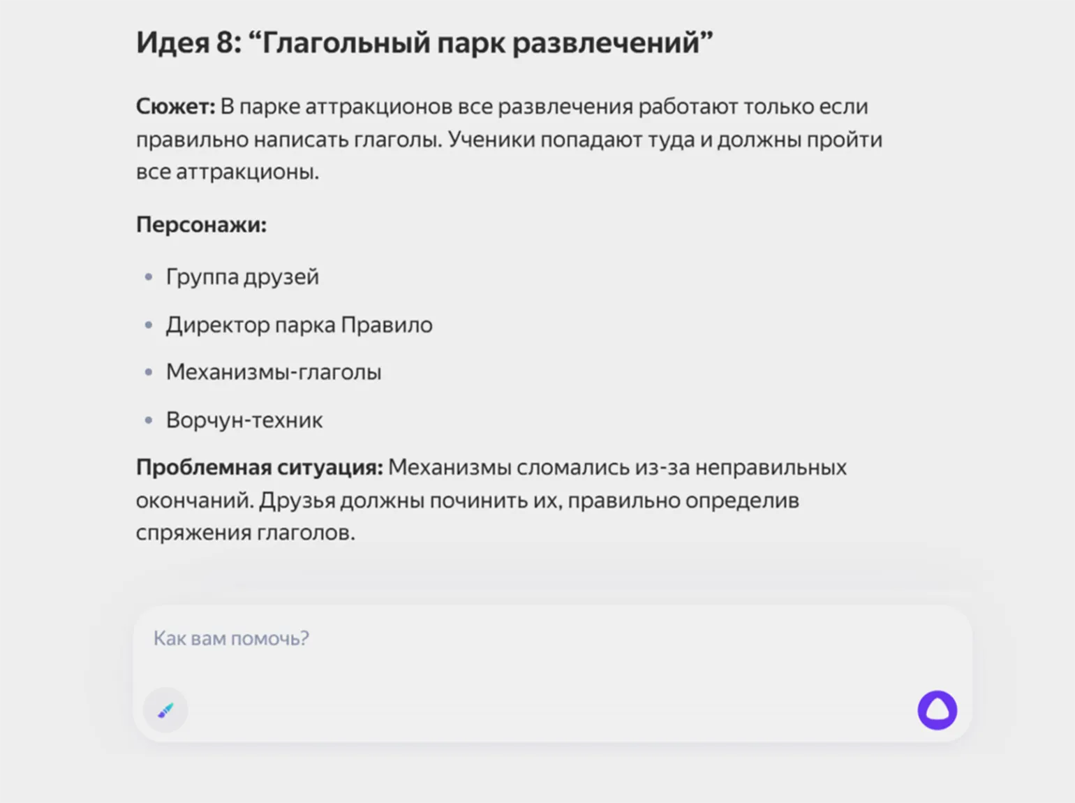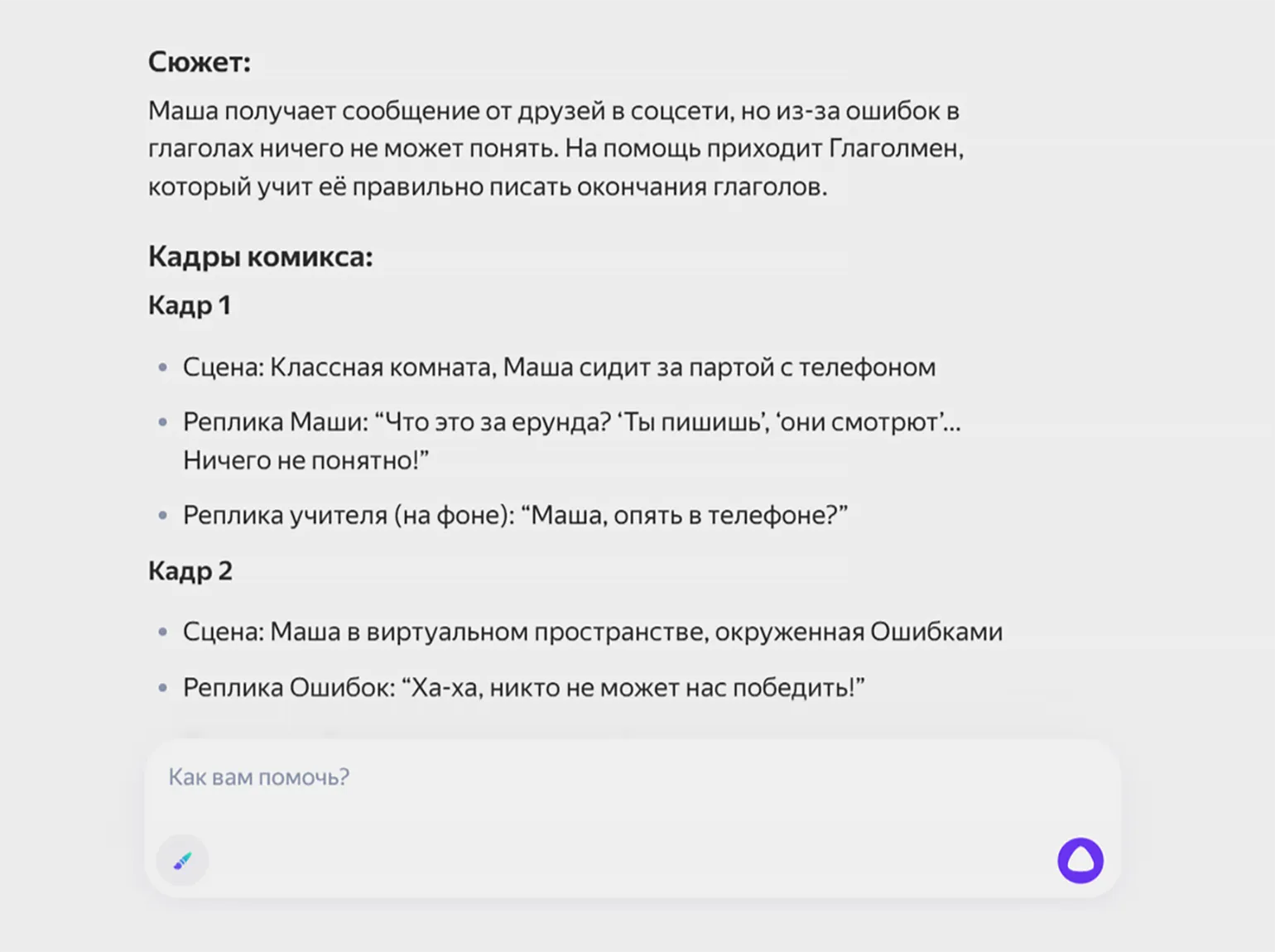 Ниже представлен пример одной из идей, предложенных нейросетью, — её вполне можно использовать не только для комикса, но и для игрового формата урока или для внеклассного мероприятия.