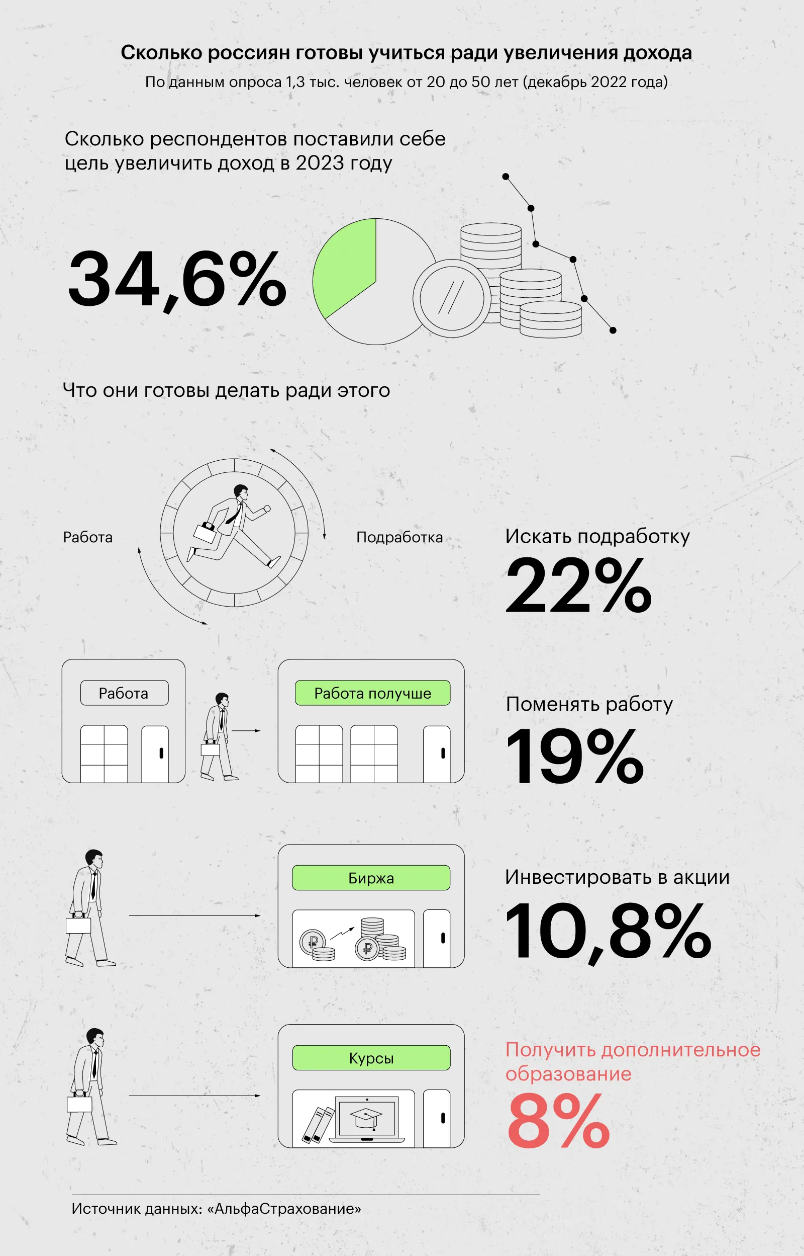 Узнать большеКомпания «АльфаСтрахование» в конце прошлого года провела опрос о главных финансовых целях россиян на 2023 год. Оказалось, что более трети (34,6%) в качестве такой цели поставили увеличение дохода. Однако лишь 8% ради этого готовы получать дополнительное образование. В основном же в качестве стратегии увеличения доходов опрошенные видят подработку или смену работы — но, видимо, не подразумевающую смену профессии или развитие новых навыков, раз это не сопряжено с получением образования.