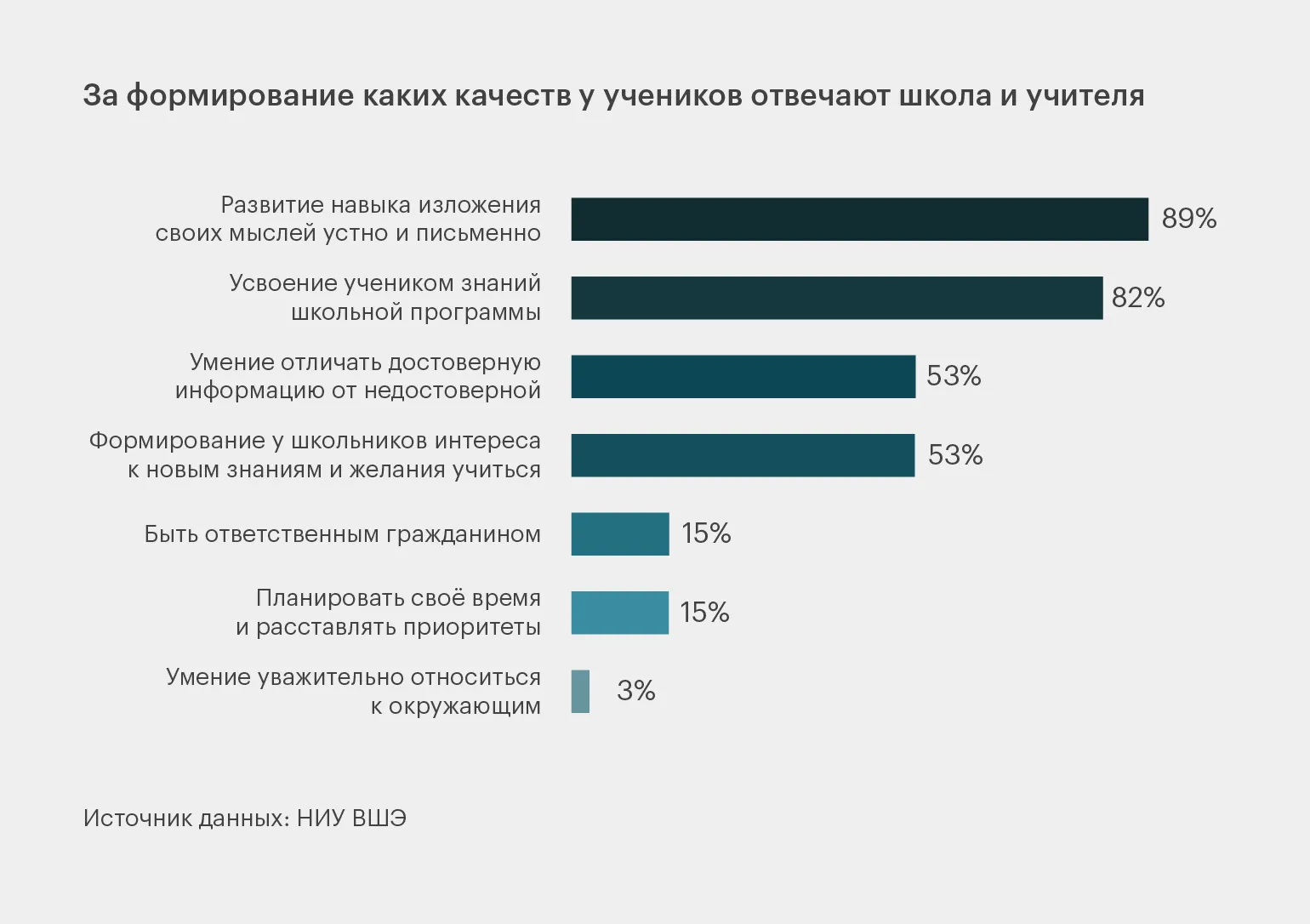 В фокус-группах проводили опрос о том, какие у учителей есть установки об образовательном процессе. Например, они отвечали на вопрос об ответственности за развитие у школьников различных навыков и умений, выбирая из вариантов: «школа/учителя», «кружки/секции», «семья», «ребёнок». Предсказуемо, большинство педагогов считают, что они в первую очередь отвечают за трансляцию детям знаний: чтобы те усвоили школьную программу, научились излагать свои мысли, отличать достоверную информацию от недостоверной. А развитие некогнитивных навыков ― способности работать в группах, самоорганизации, креативности, ― по мнению многих учителей, должно происходить вне школы.