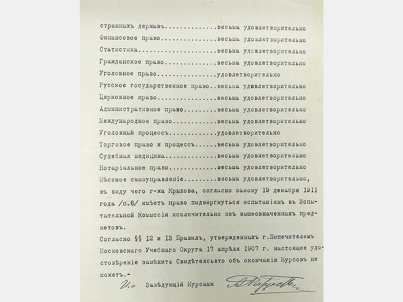 Лишь законом 1911 года выпускницам женских курсов, чьи программы официально признавались равнозначными университетским, разрешалось проходить «окончательные испытания» в государственных комиссиях при университетах наравне с выпускниками-мужчинами. Для этого каждой выпускнице требовалось получить особое разрешение министерства, а сдавать нужно было, ни много ни мало все обязательные предметы, входившие в программу факультета за годы обучения на курсах. Причём предварительно следовало сдать ещё и экзамены по программе мужских гимназий.