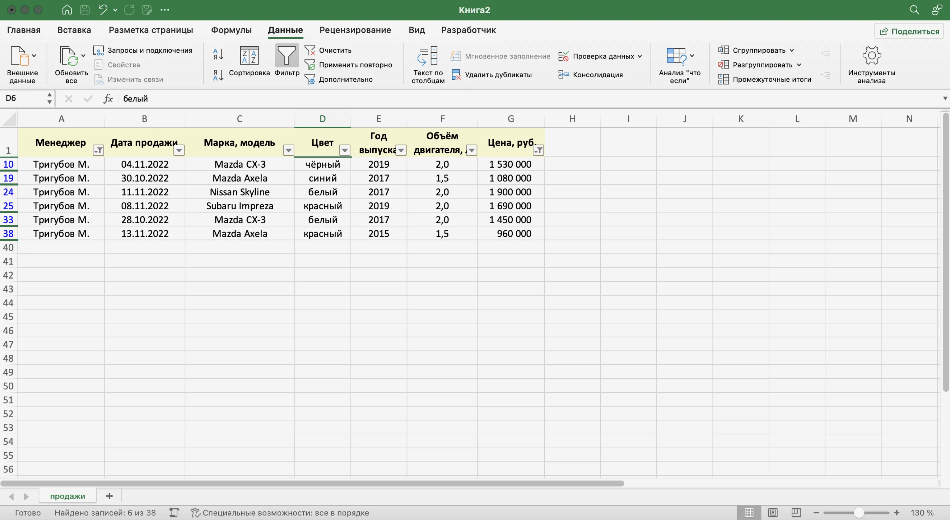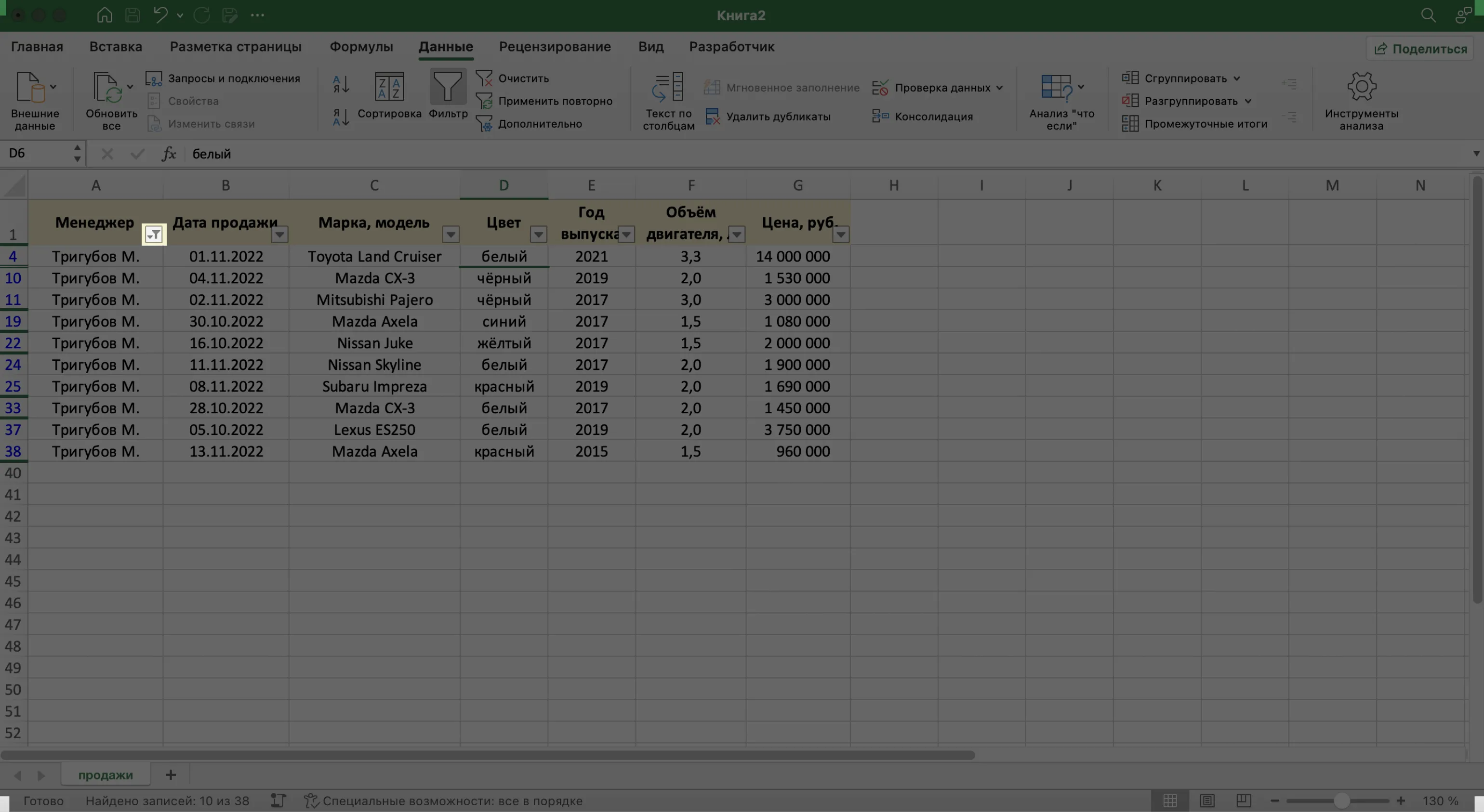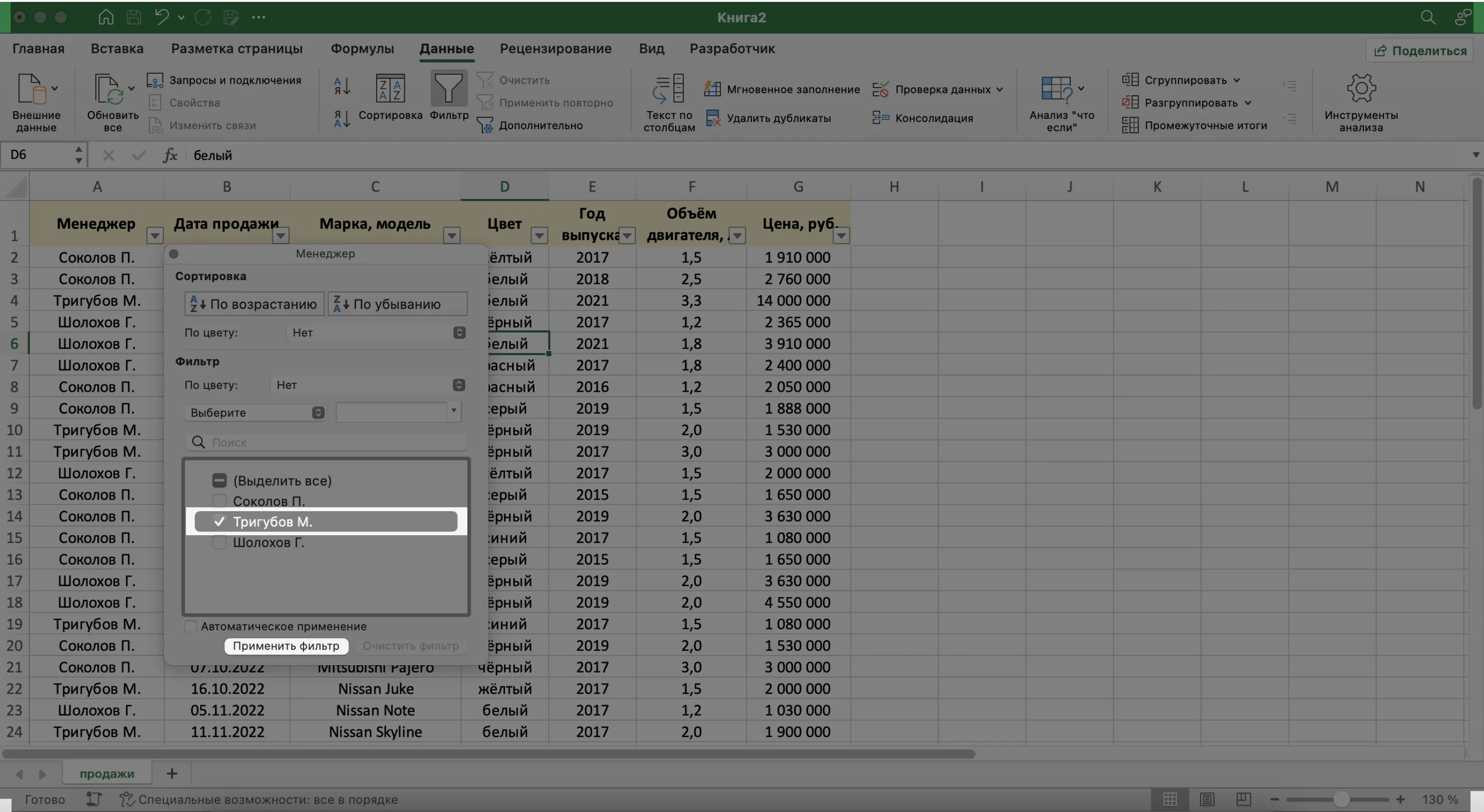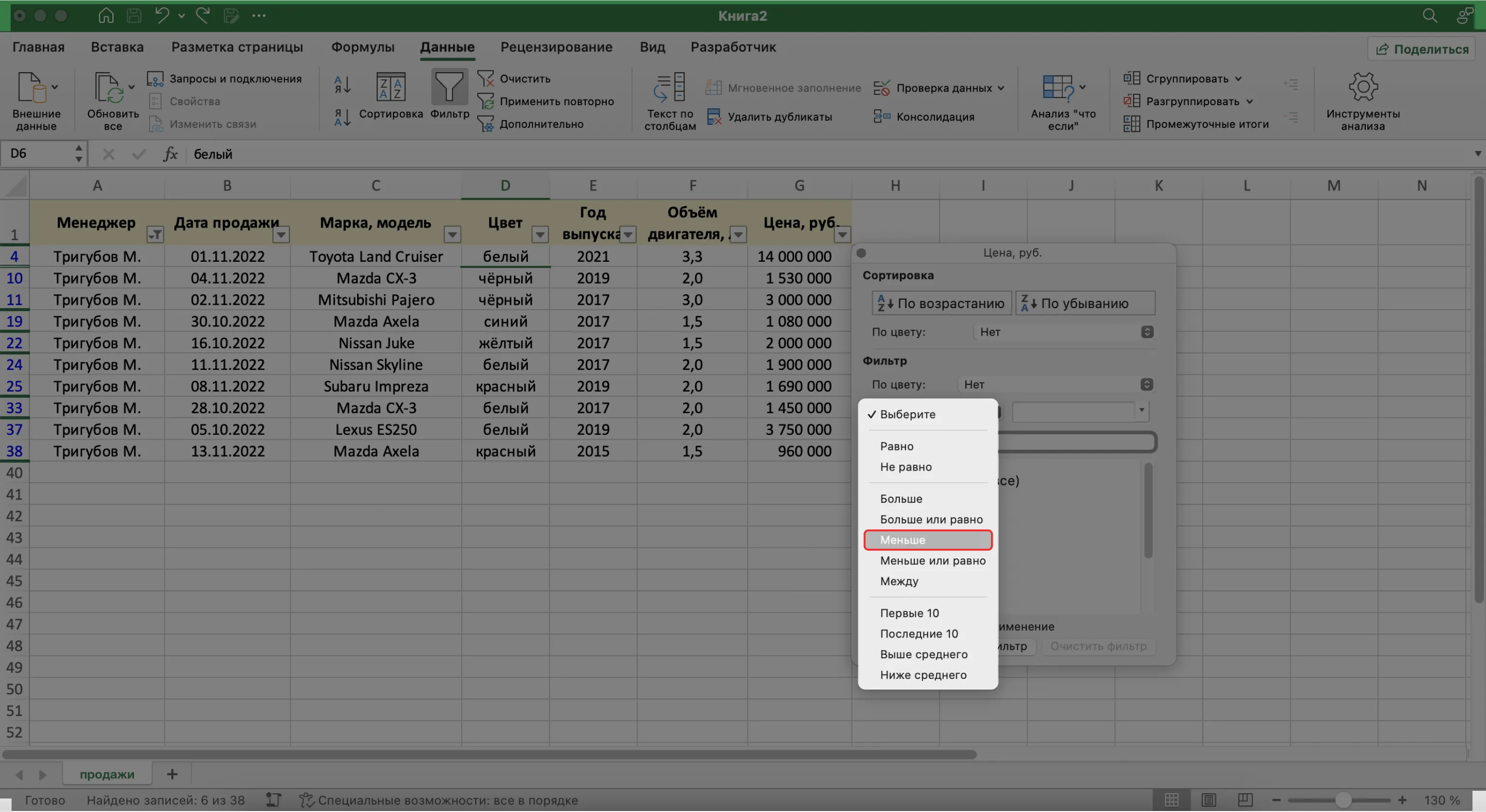 Записи БД можно фильтровать по нескольким параметрам одновременно. Для примера покажем среди продаж Тригубова М. только автомобили дешевле 2 млн рублей.