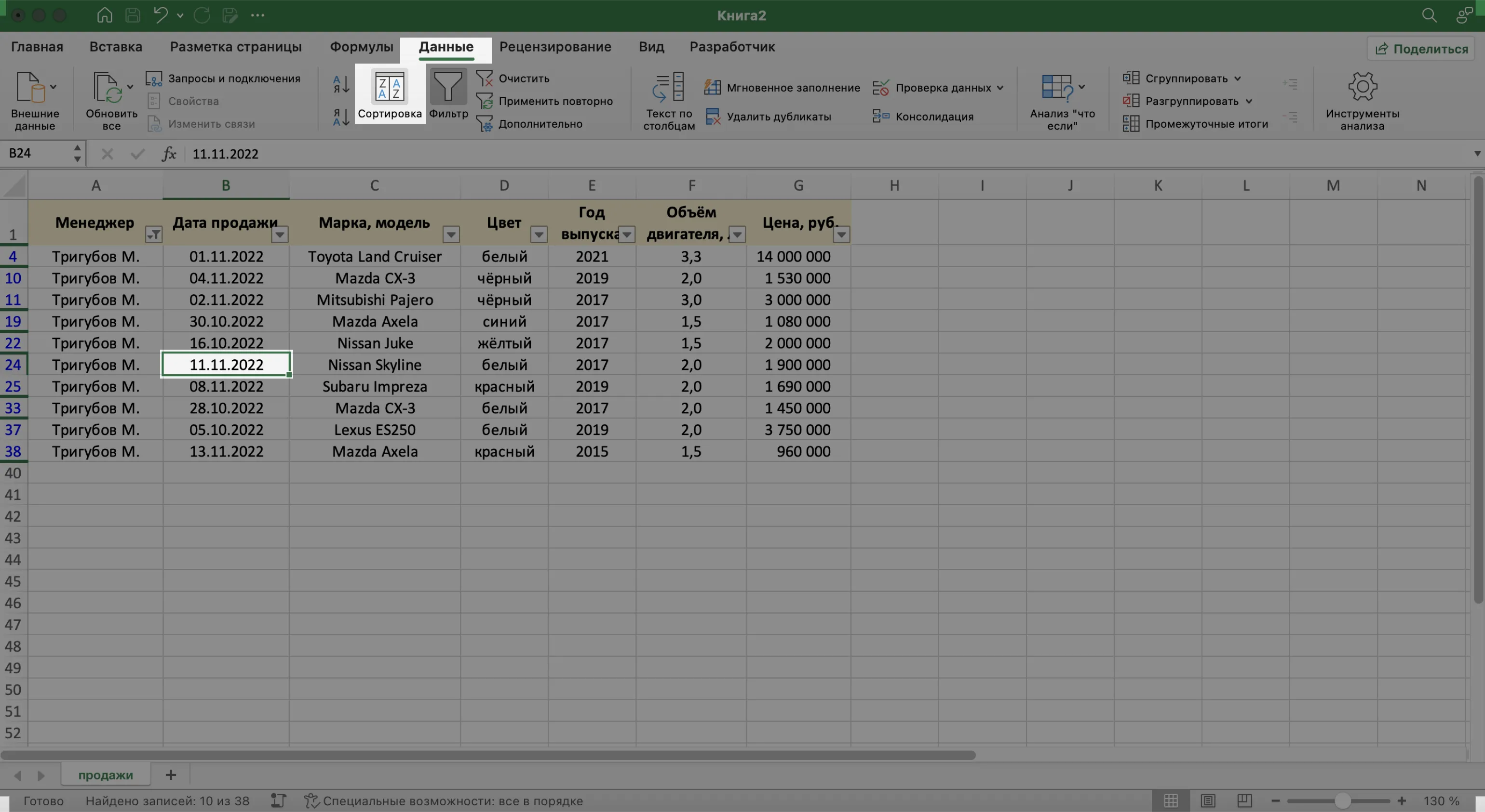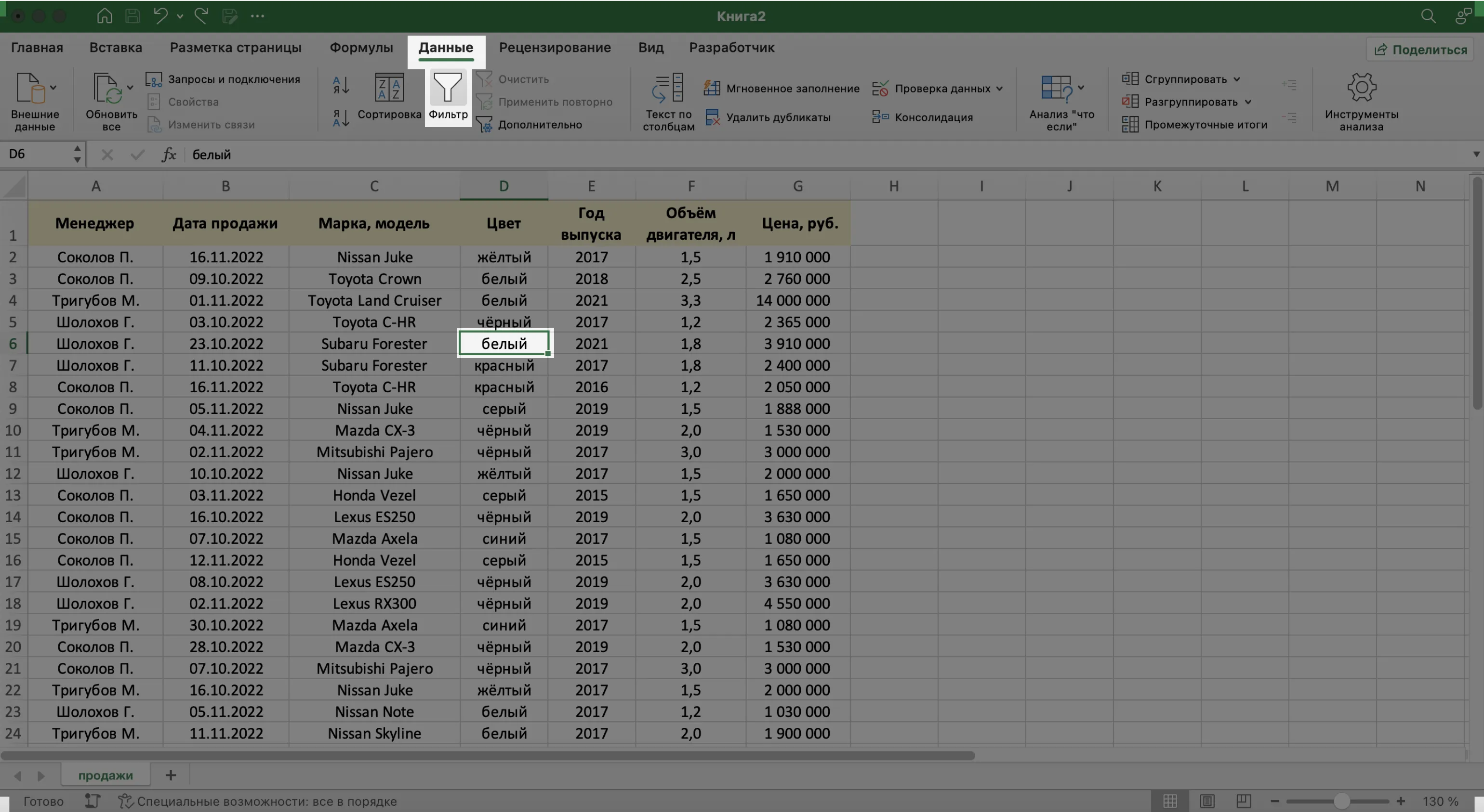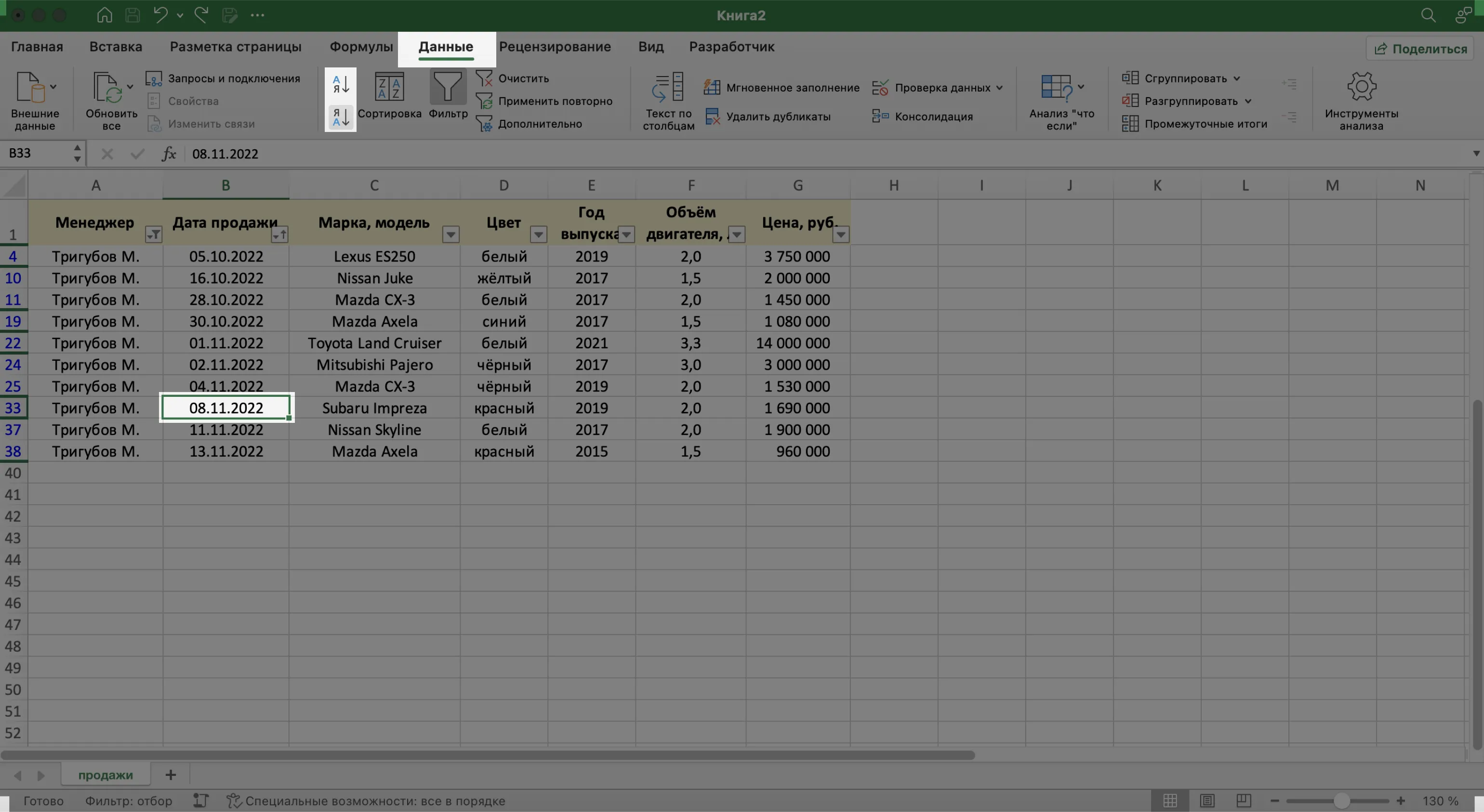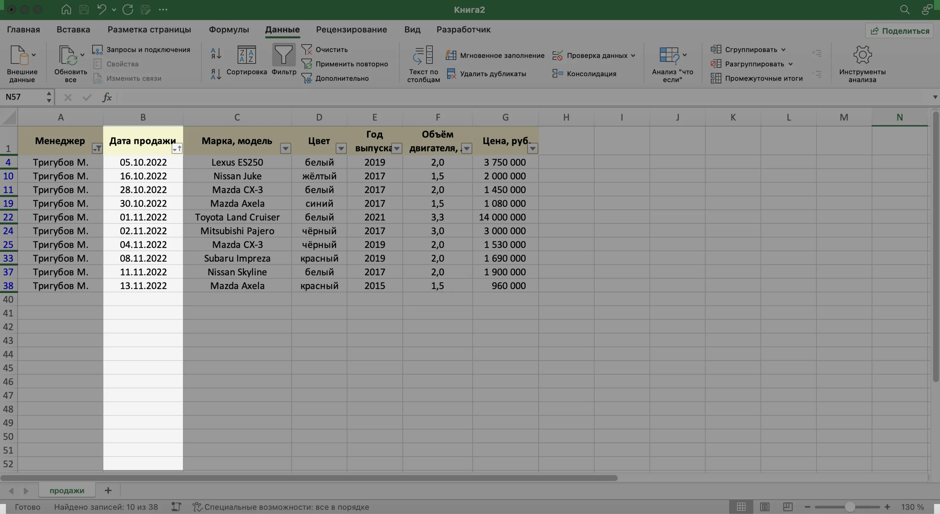Записи БД можно фильтровать по нескольким параметрам одновременно. Для примера покажем среди продаж Тригубова М. только автомобили дешевле 2 млн рублей.