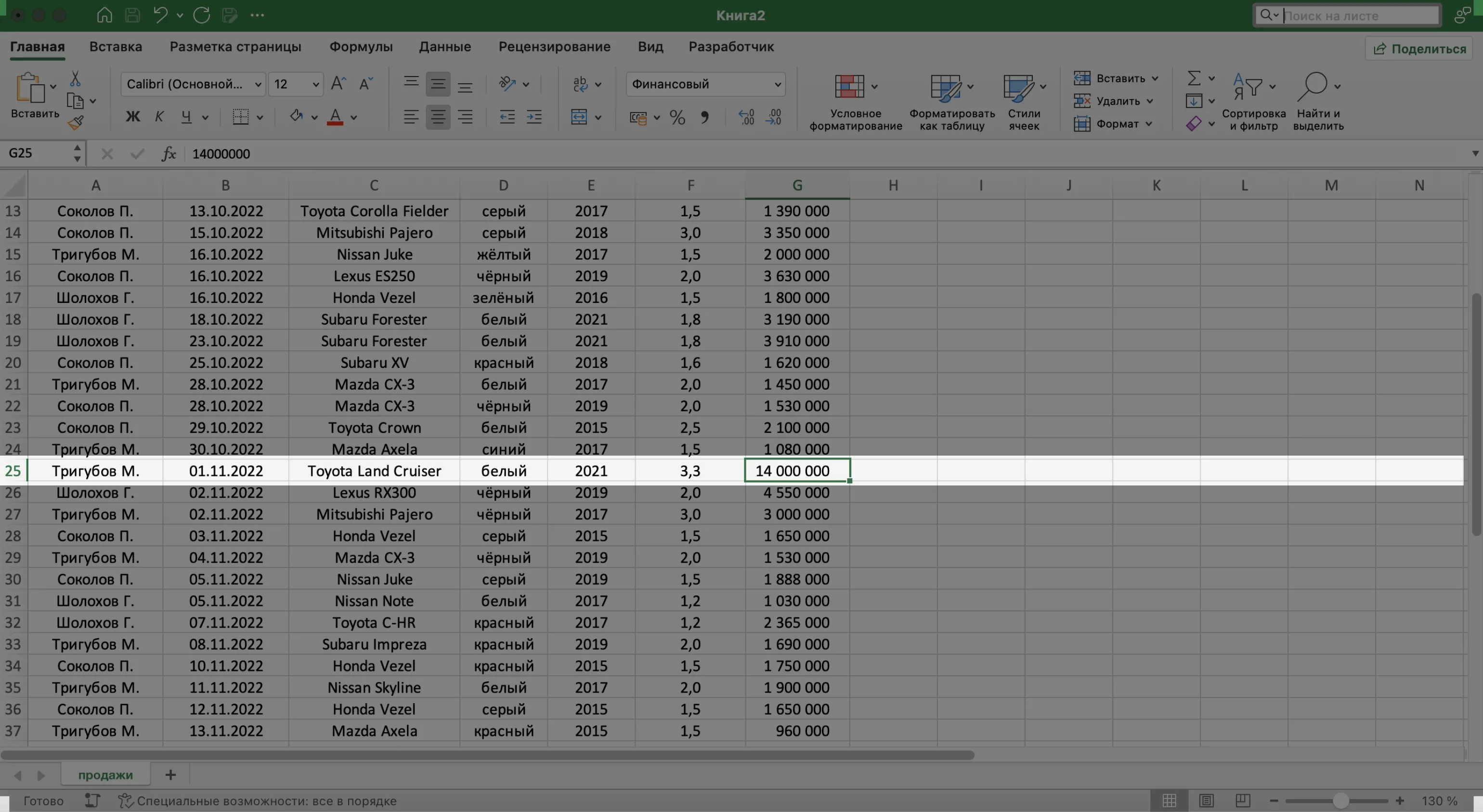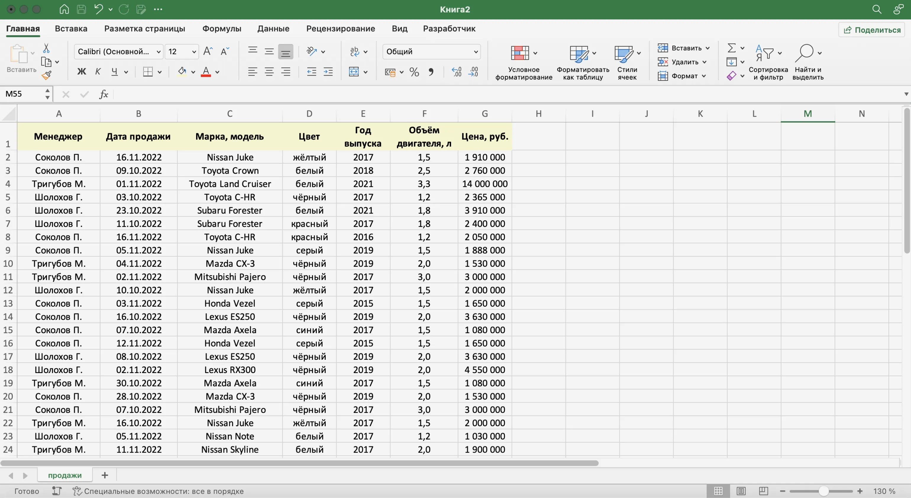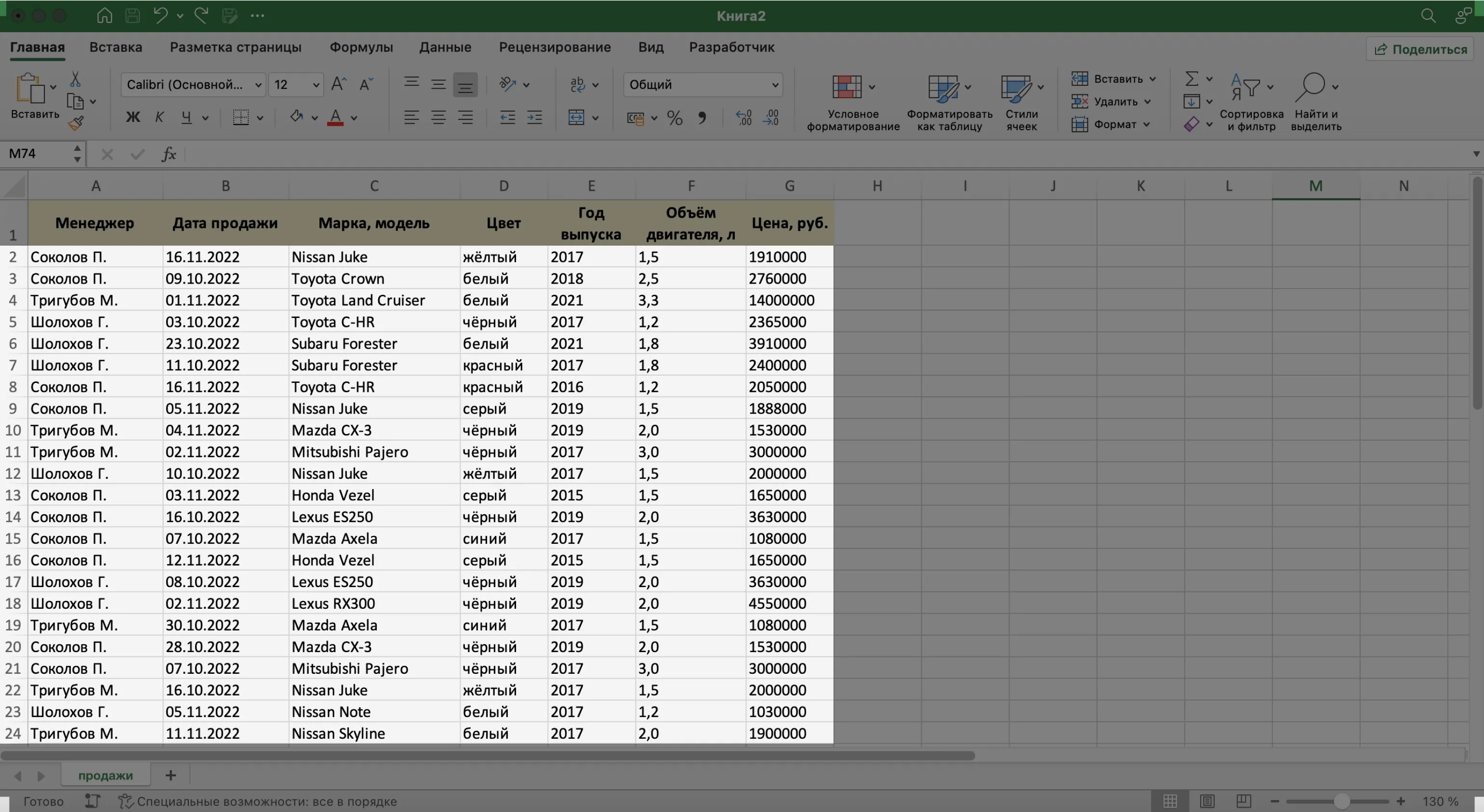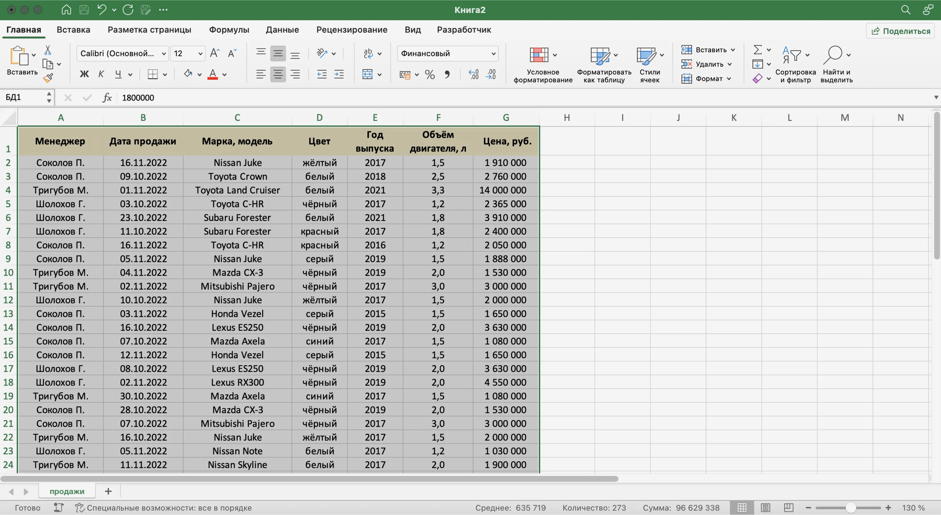 Записи БД можно фильтровать по нескольким параметрам одновременно. Для примера покажем среди продаж Тригубова М. только автомобили дешевле 2 млн рублей.