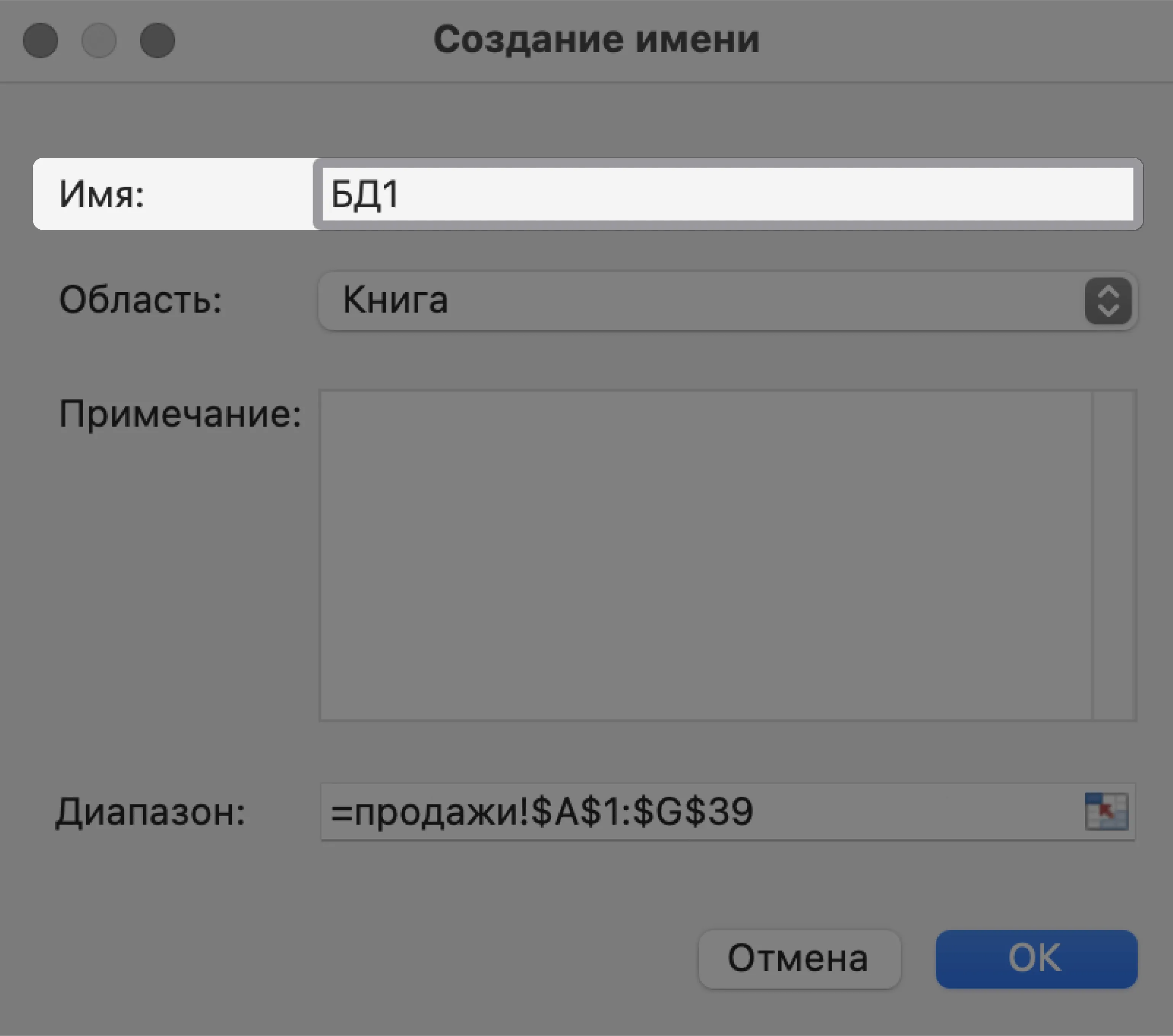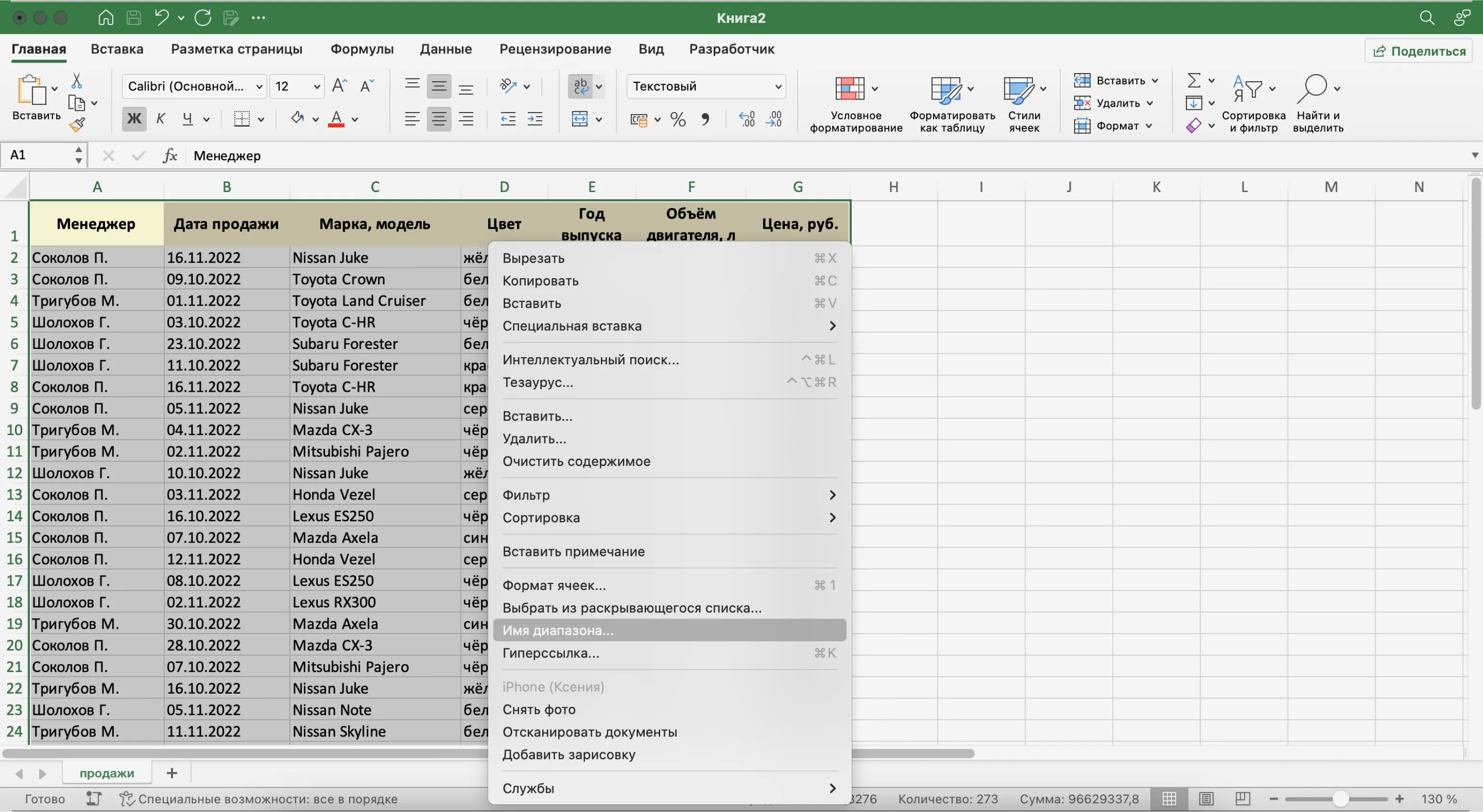 Для этого выделим все поля и записи базы данных, включая шапку. Нажмём правой кнопкой мыши и выберем «Имя диапазона».