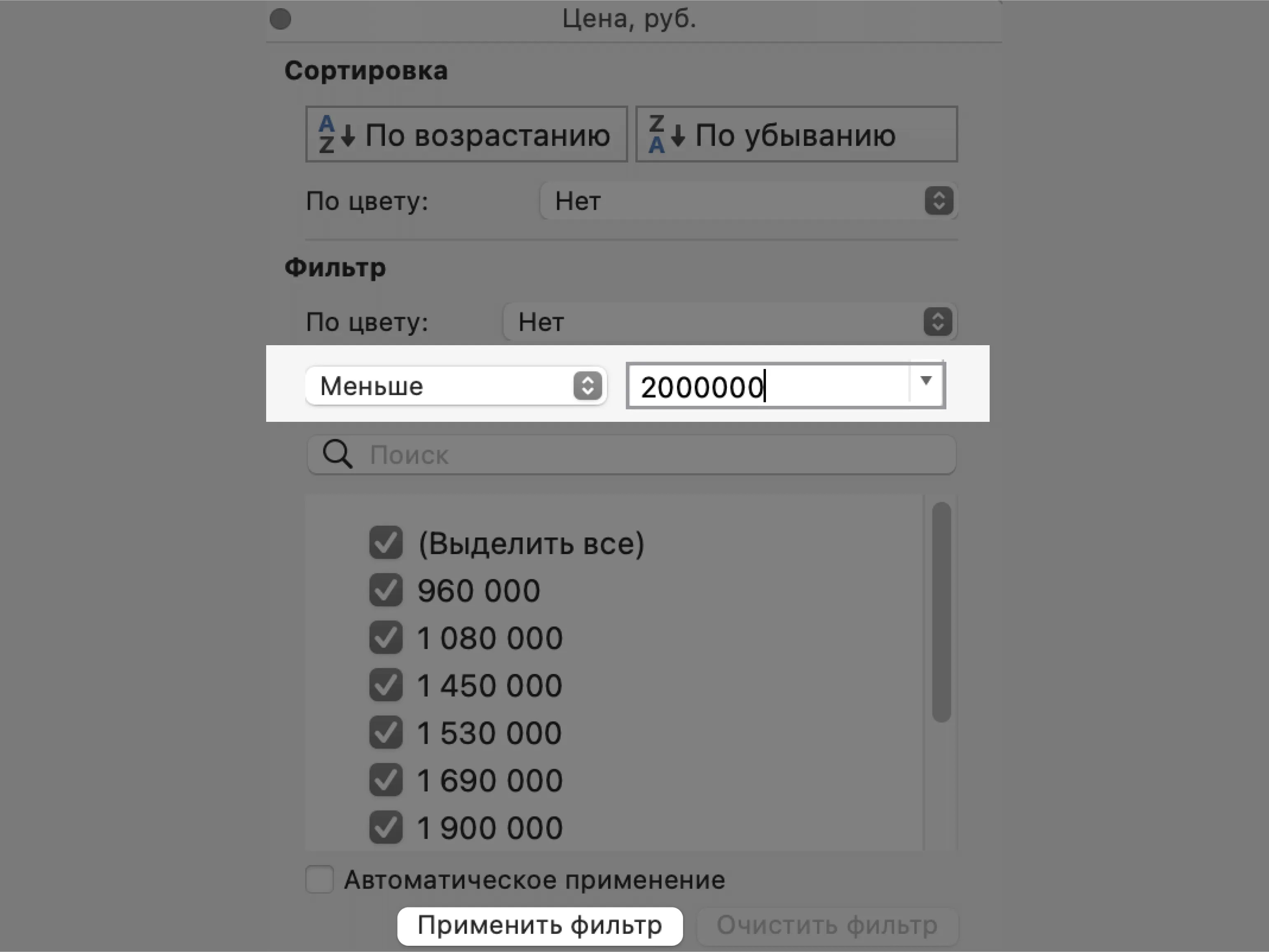 Затем в появившемся окне дополним условие фильтрации — в нашем случае «Меньше 2000000» — и нажмём «Применить фильтр».