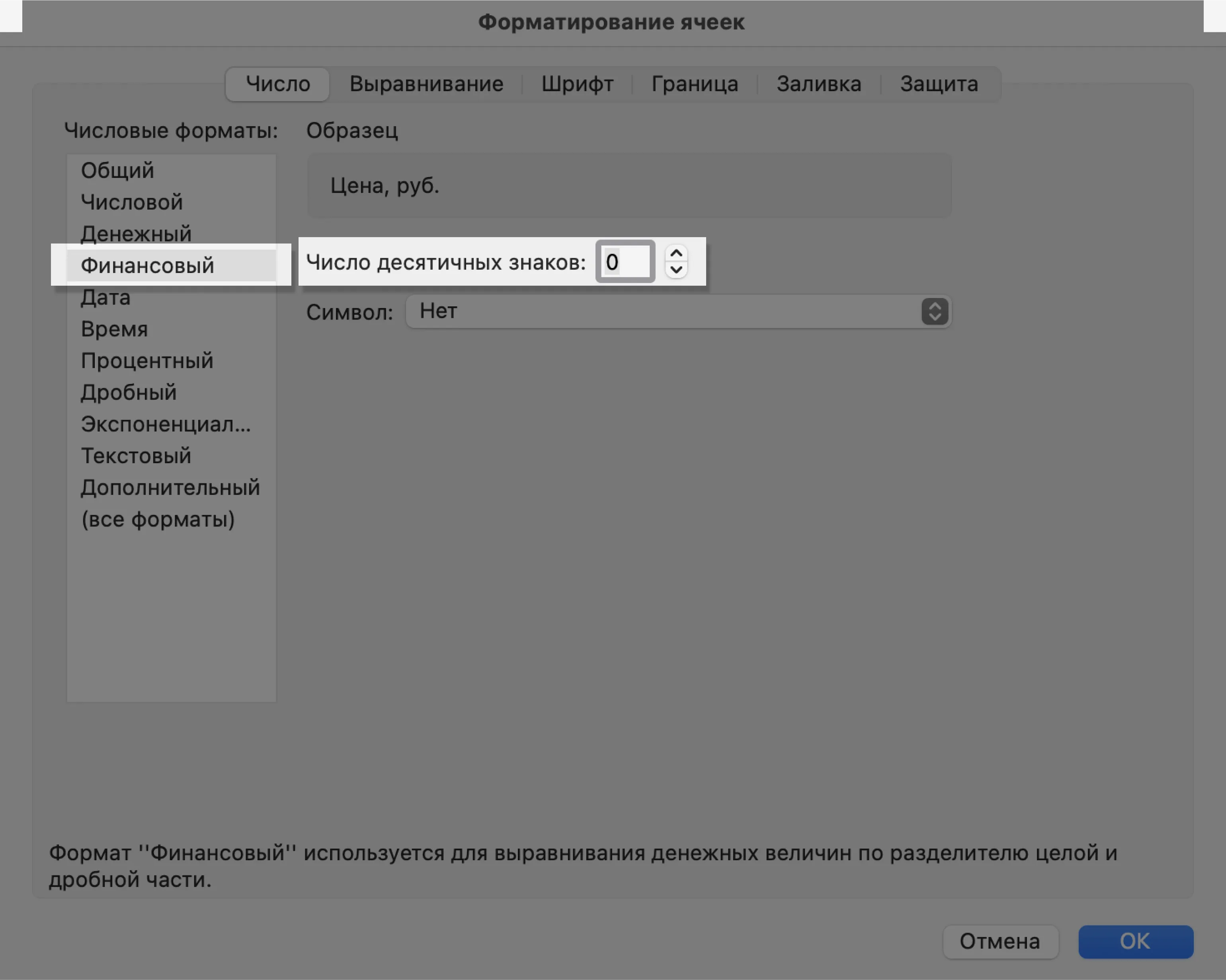 В появившемся меню выберем нужный формат и настроим его. В нашем примере для ячейки «Цена, руб.» выберем финансовый формат, уберём десятичные знаки (знаки после запятой) и выключим отображение символа ₽.