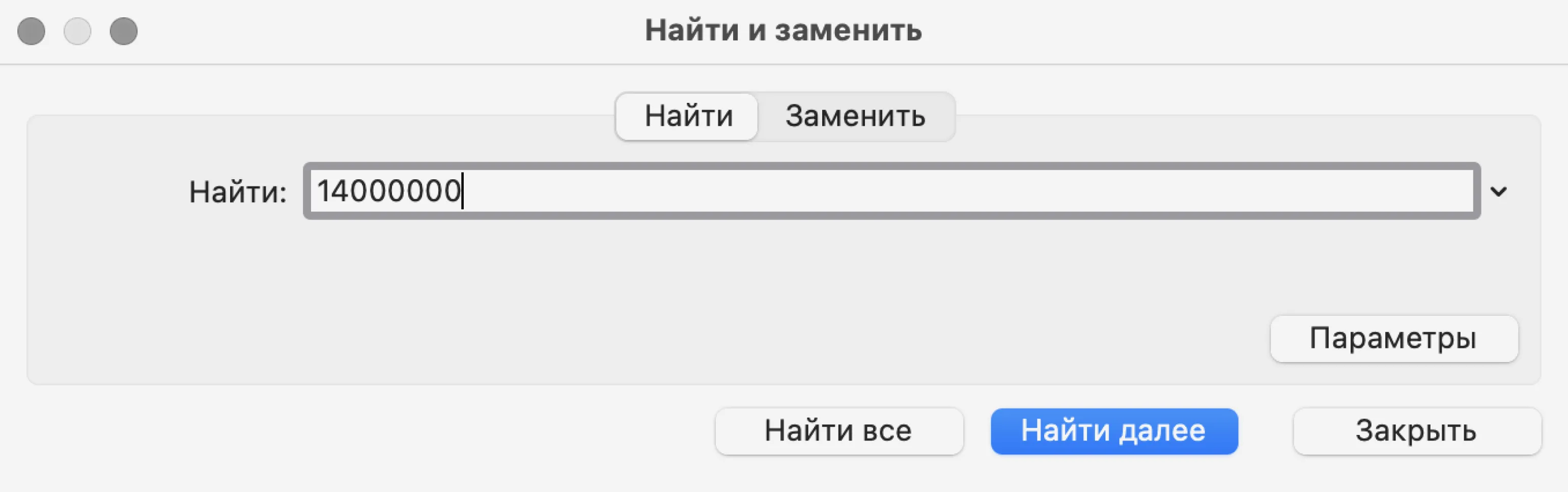 В появившемся окне введём значение, которое нужно найти, — 14000000 — и нажмём «Найти далее».