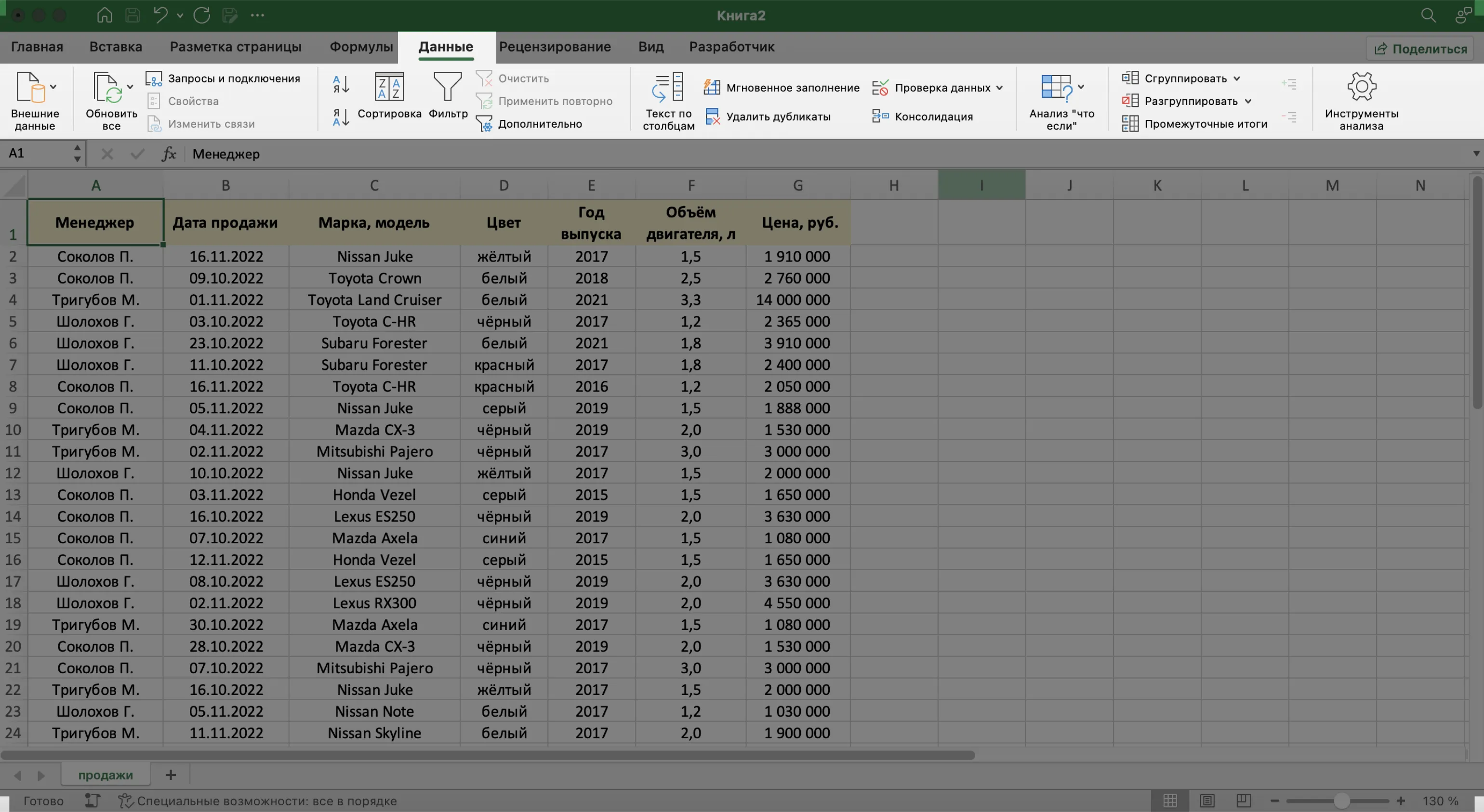 Сейчас в созданной базе данных все записи расположены хаотично — не упорядочены ни по датам, ни по фамилиям менеджеров. Разберёмся, как привести БД в более удобный для работы вид. Все необходимые для этого функции расположены на вкладке «Данные».