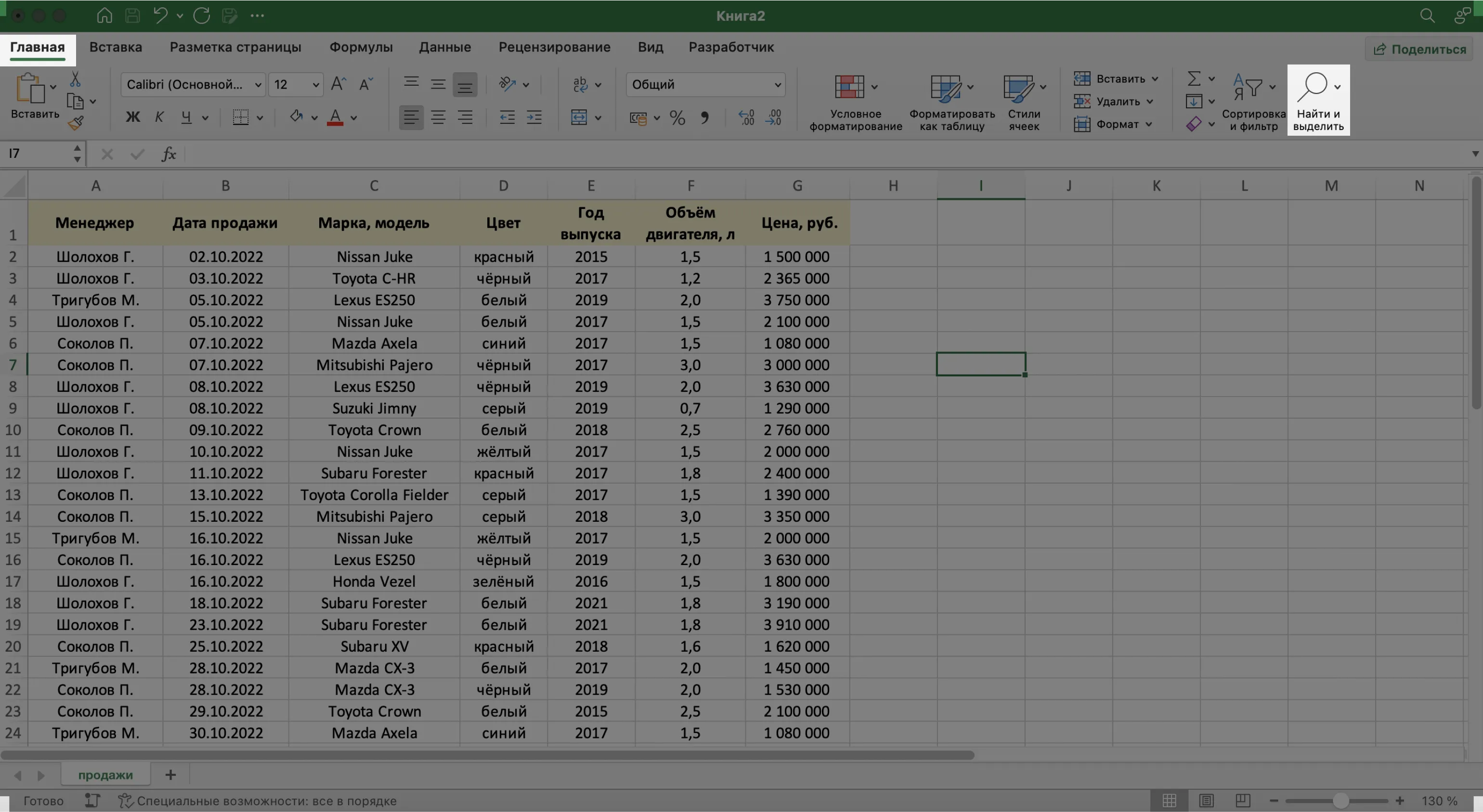 Предположим, нужно найти в БД автомобиль стоимостью 14 млн рублей. Перейдём на вкладку «Главная» и нажмём на кнопку «Найти и выделить». Также быстрый поиск можно задавать с любой вкладки Excel — через значок лупы в правом верхнем углу экрана.