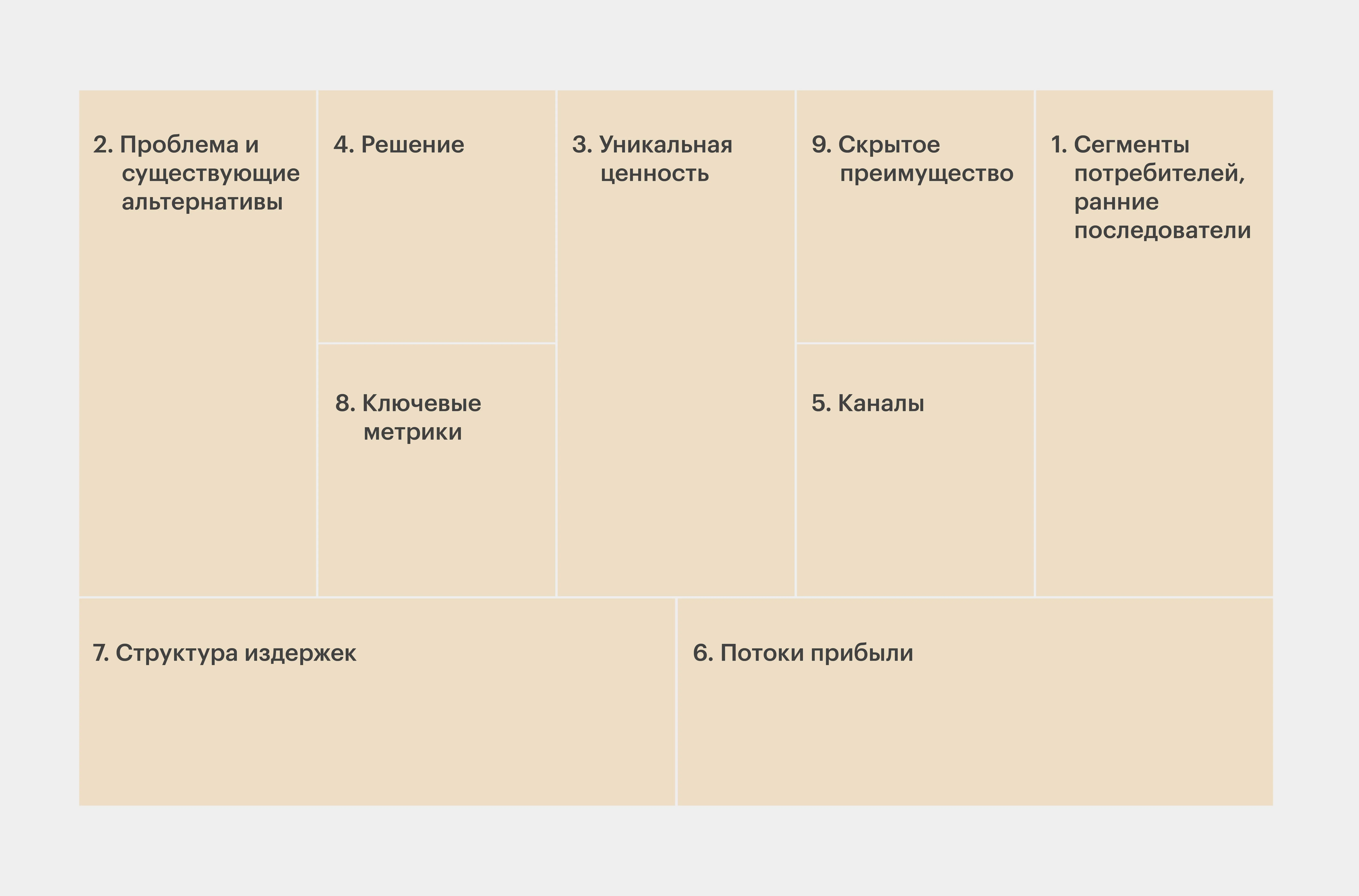 Lean Canvas отталкивается от методологии lean startup, «бережливый стартап». Эта технология направлена на экономию ресурсов: мы не делаем то, что никому не нужно, а сначала узнаём потребности, и только потом начинаем строить этот бизнес. Подробно мы разбираем Lean Canvas вот здесь: там есть и описание отдельных сегментов, и сравнение с Business Model Canvas.