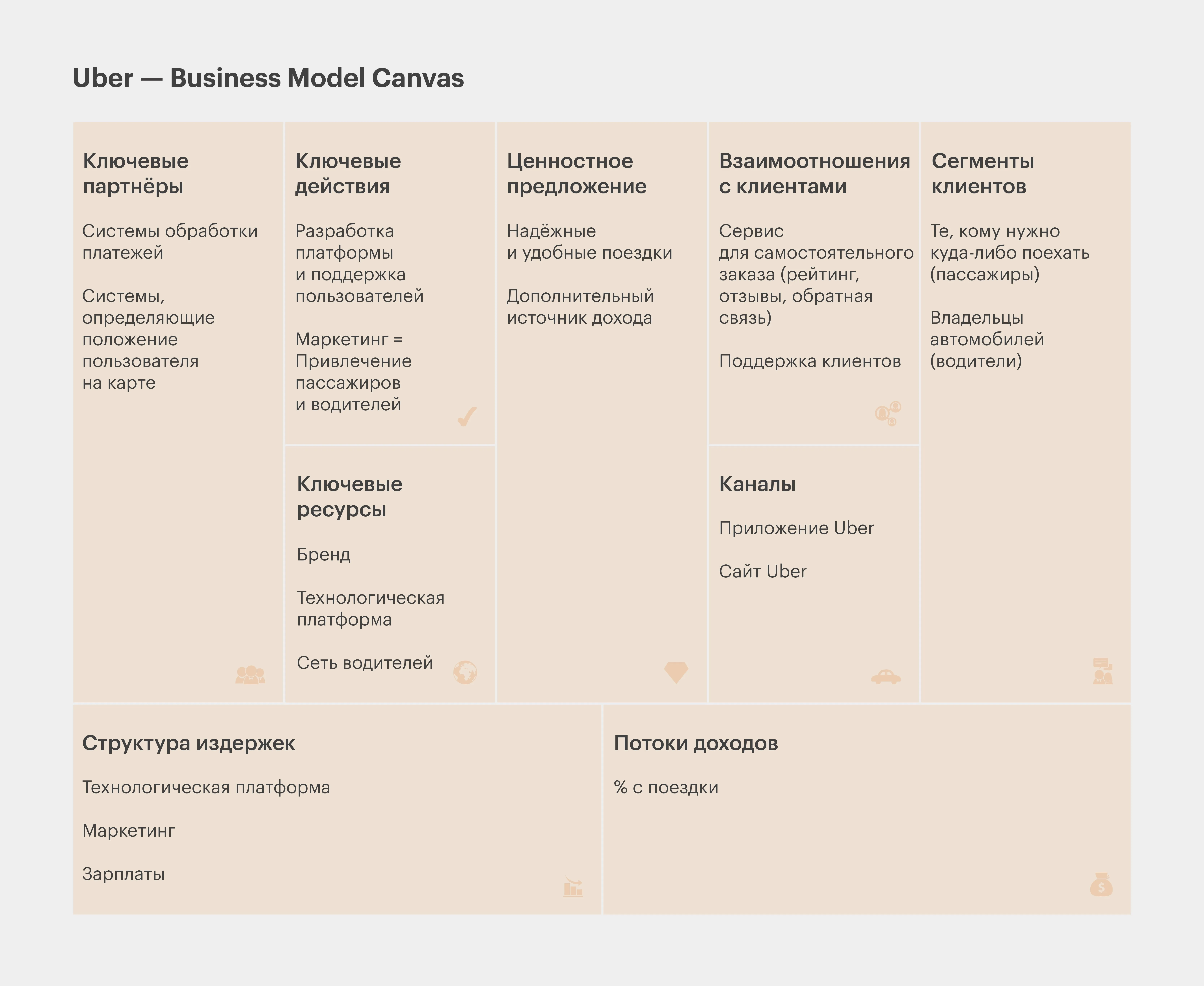 Давайте посмотрим, как были бы заполнены шаблоны Business Model Canvas реально существующих проектов. Это примеры с сайта Business Model Analyst, который разбирает бизнес-модели известных компаний. Мы начнём с Uber.