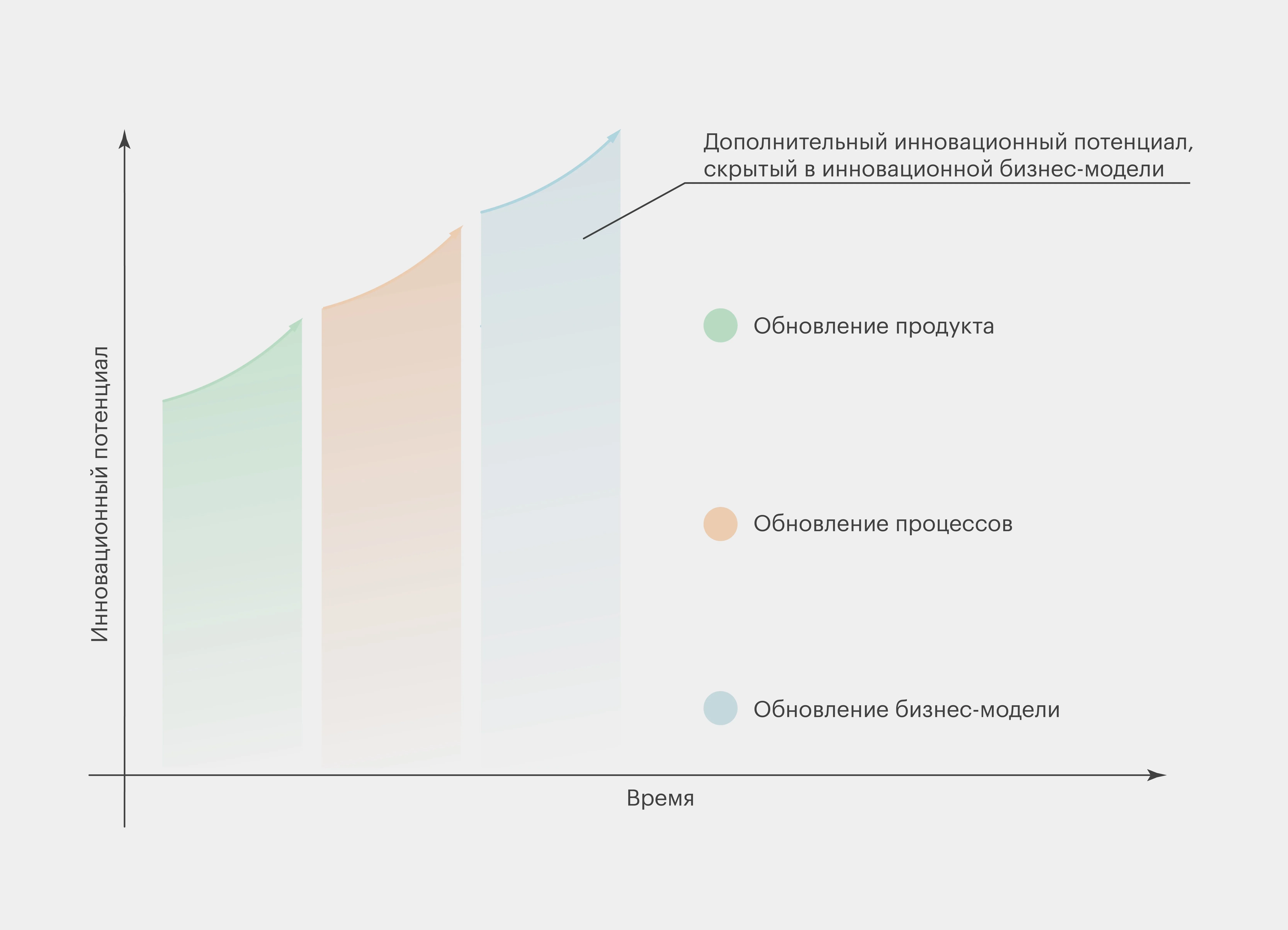 Посмотрите на график ниже: он показывает скрытый инновационный потенциал бизнес-модели. Сначала, на старте проекта, вам нужно обновить продукт. Следующий шаг — обновление процессов. Но потом вы обновляете бизнес-модель. Это скрытый потенциал: бизнес-модель может реализовать неочевидные возможности вашего продукта или компании.