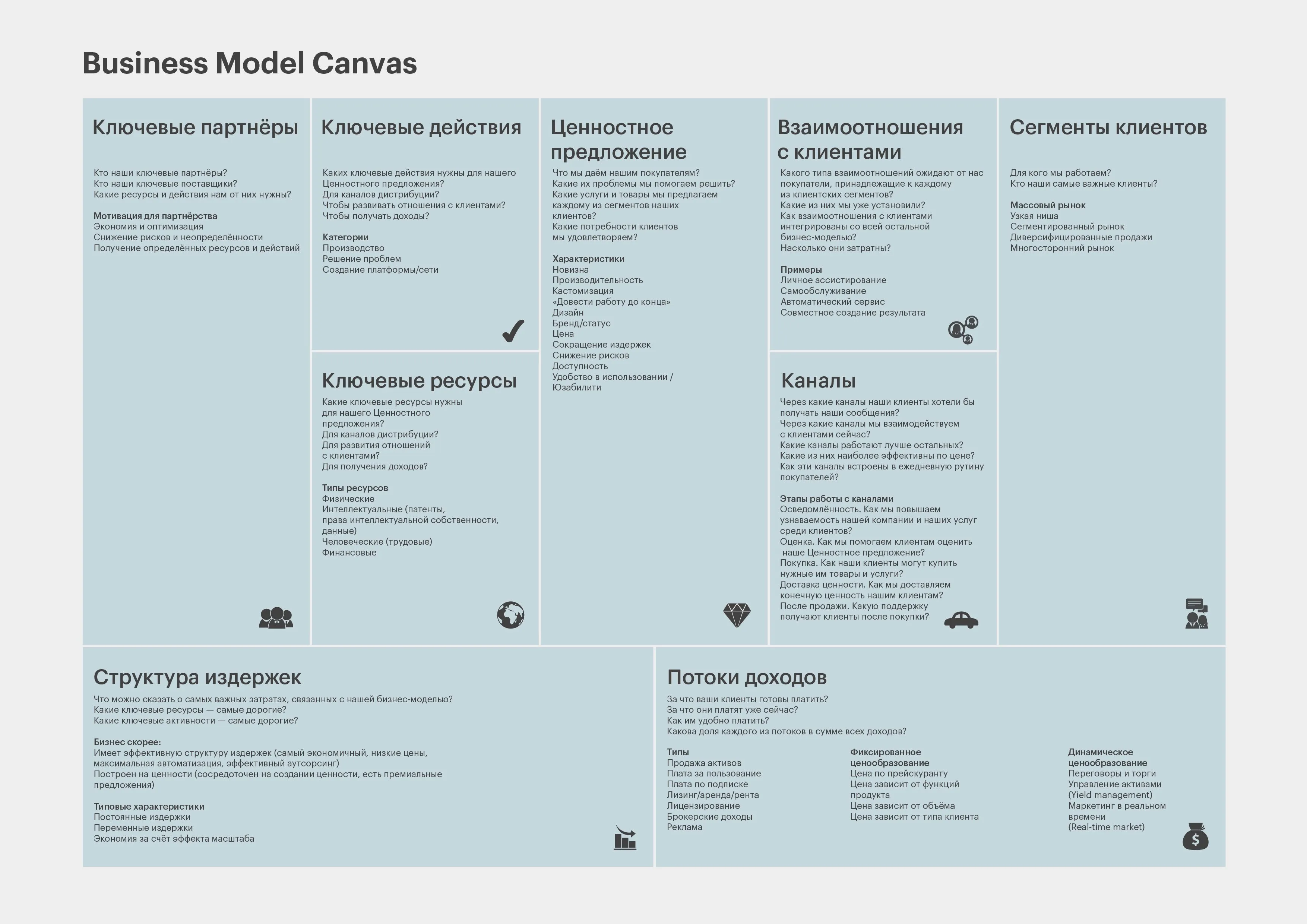 Однако Business Model Canvas — это базовая, очень популярная модель. Создаёте ли вы стартап или хотите проанализировать уже действующий бизнес — посмотрите в первую очередь на эту методику.