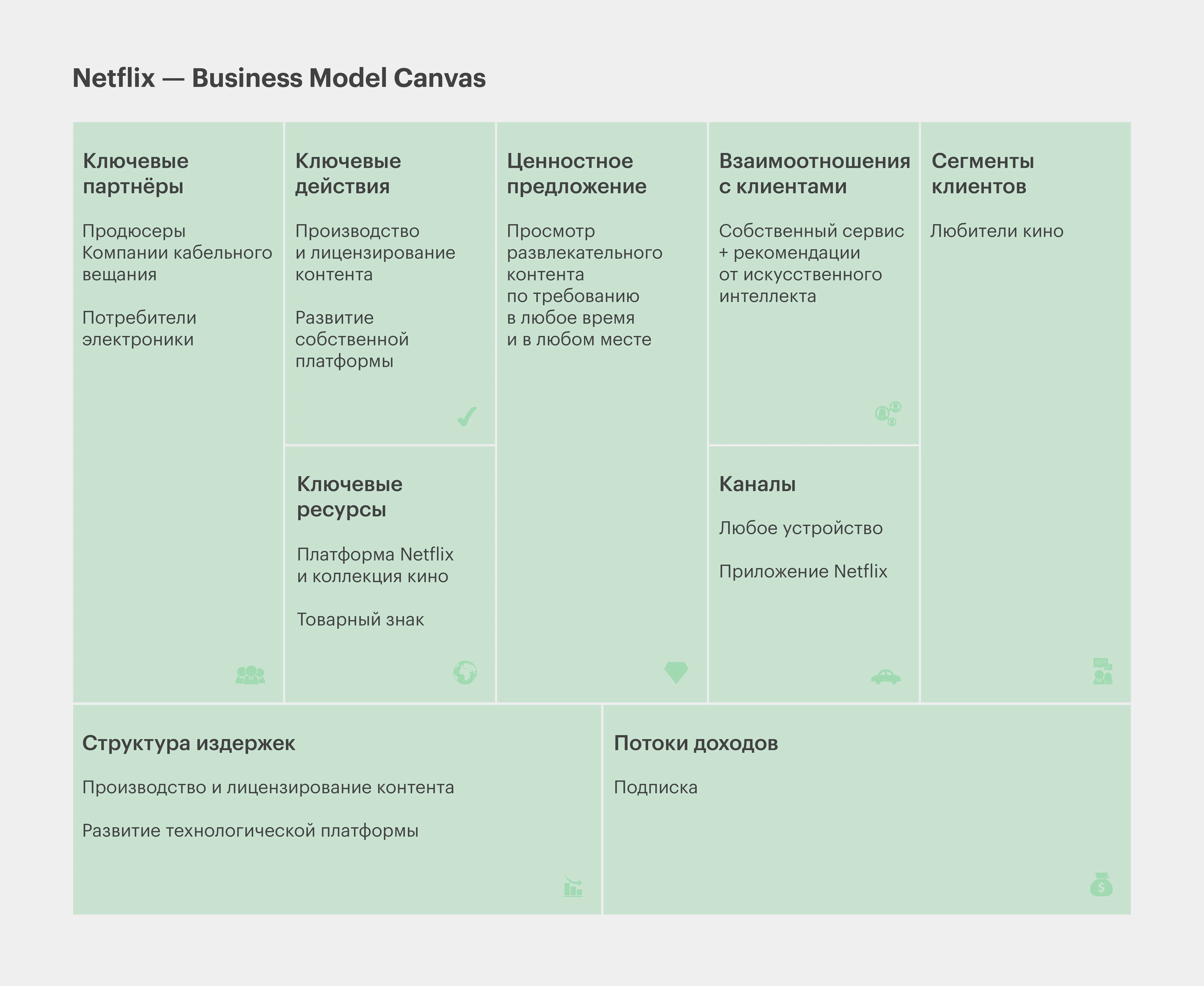 Netflix — это стриминговая платформа, которая объединяет в себе две бизнес-модели: контент по запросу и «съешь столько, сколько сможешь». Разбор компании на канве бизнес-модели представлен ниже.
