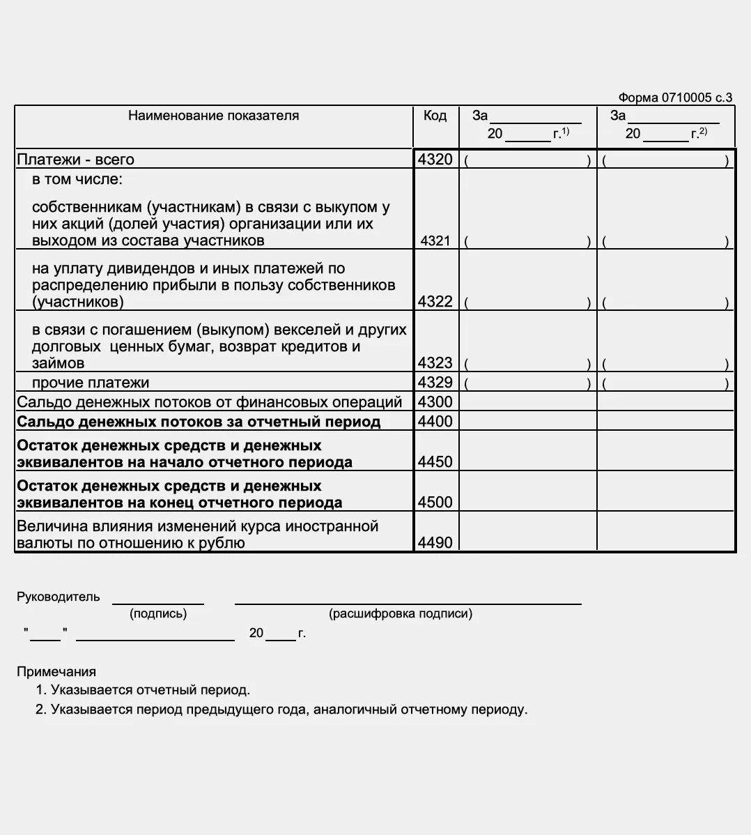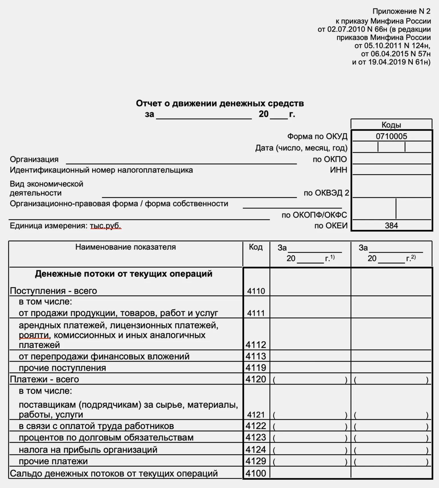 Бланк формы отчёта о движении денежных средств — таблица с показателями, над которой приведены: