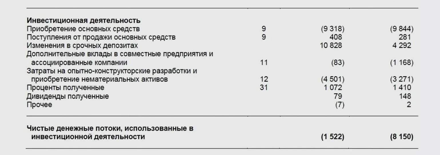 Итог этого раздела — строка «Чистые денежные потоки, использованные в инвестиционной деятельности».