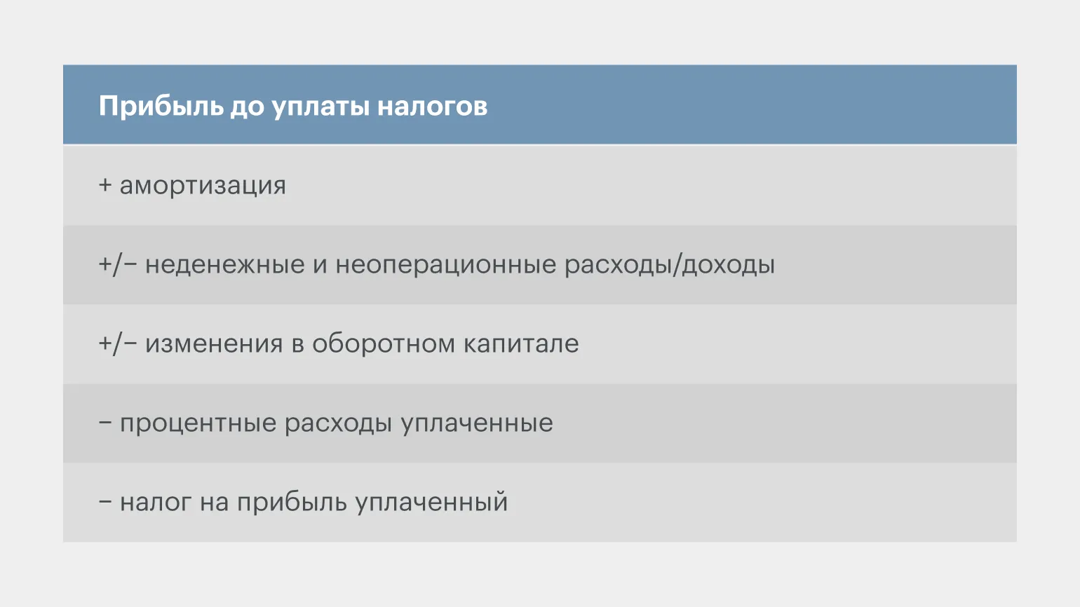По такому же принципу компания анализирует все остальные строки отчёта о финансовых результатах — находит неоперационные и неденежные доходы или расходы и корректирует на эту сумму отчёт о движении денежных средств.