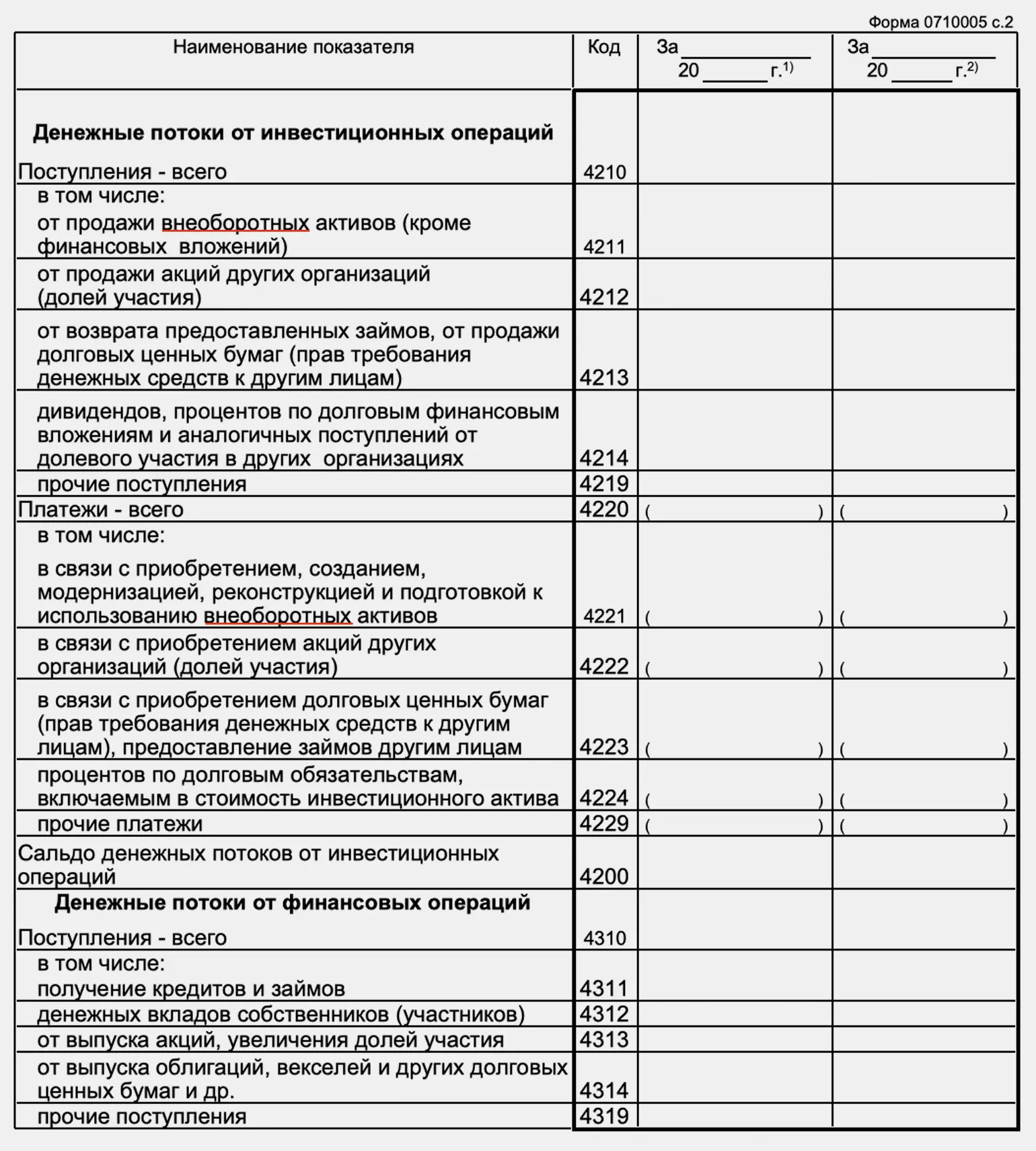На иллюстрации ниже приведена форма отчёта о движении денежных средств с перечнем строк, которые нужно заполнить.