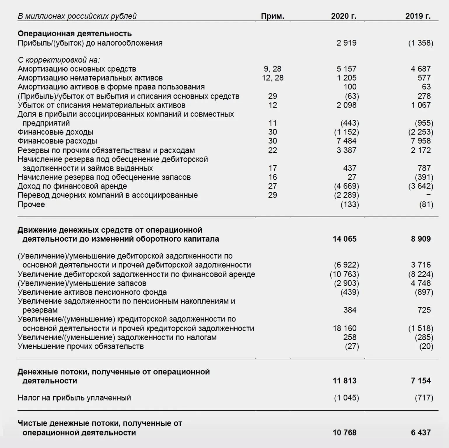 Раздел составлен косвенным способом. В первой строке, как мы говорили выше, — прибыль (убыток) компании до налогообложения. Это значение взято из отчёта о финансовых результатах.