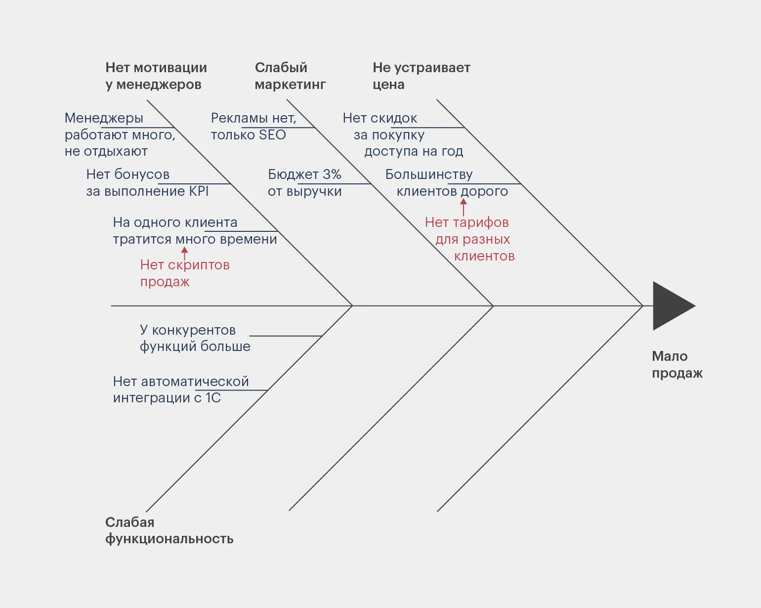 Если есть затруднения с поиском ключевых факторов, можно обратиться к опыту конкурентов. Вот список самых распространённых проблем, которые обычно описывают в диаграмме: