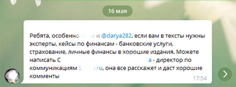 Вы наверняка знакомы с коллегами — спросите у них лично, могут ли они кого-то порекомендовать. Или напишите с просьбой о помощи в закрытый чат, где вы общаетесь. Бывает, что у коллег уже налажены хорошие отношения с экспертами, которые могут дать комментарии и по вашим вопросам. Сарафанное радио не раз меня выручало.