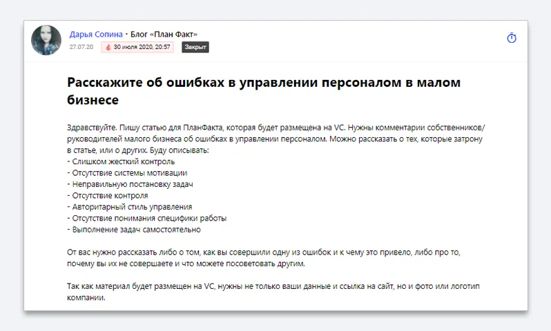 Но даже на идеальный запрос не всегда приходят люди. Недавно была ситуация, когда для актуальной темы о финансовой ответственности персонала мне не удалось собрать ни одного комментария. Так бывает, потому что запросов в ленте много и «ваши» эксперты могут не увидеть публикацию, особенно если заходят в сервис раз в пару дней.