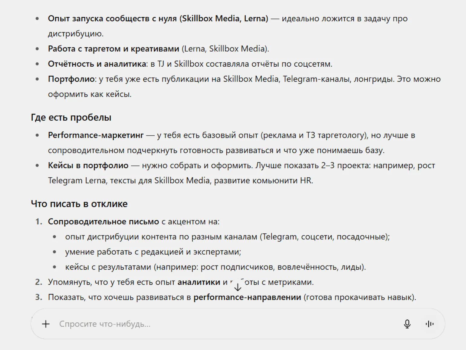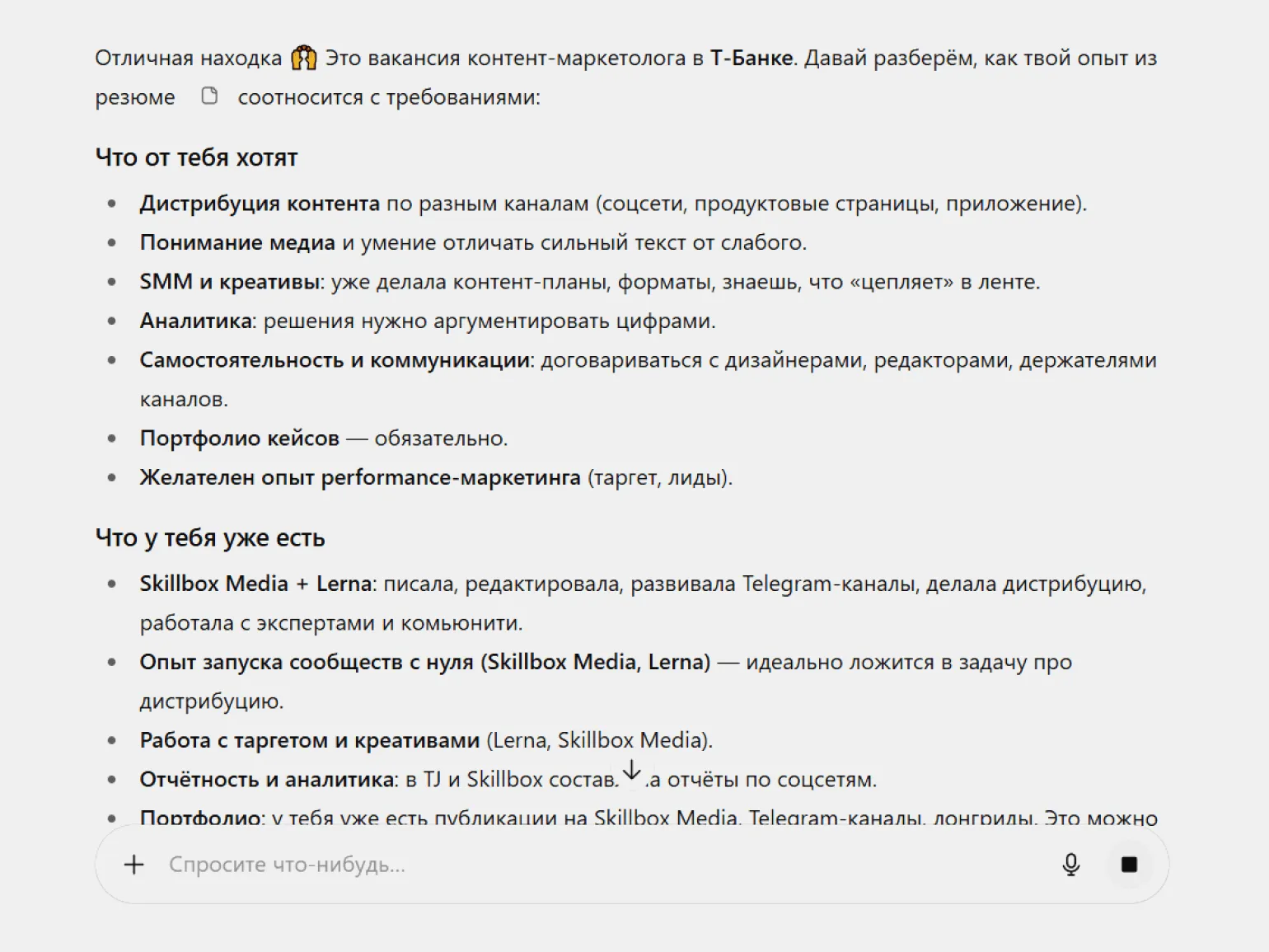 Пример промпта: «У меня есть резюме (я прикреплю его файлом или текстом). Я хочу откликнуться на вакансию (ниже вставлю описание). Сопоставь требования и обязанности вакансии с моим опытом. Сформулируй: