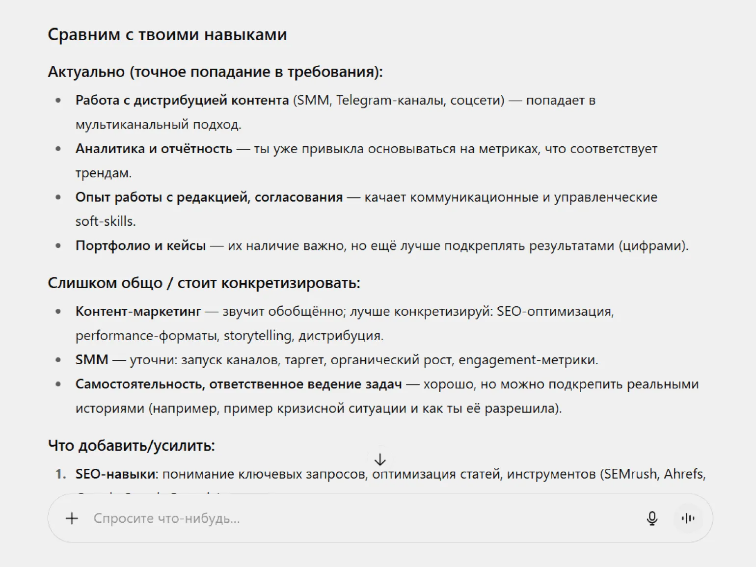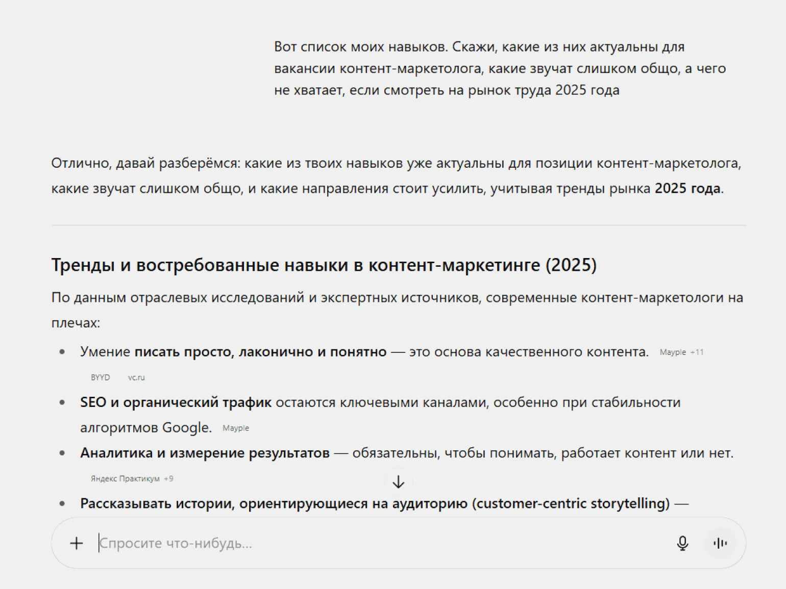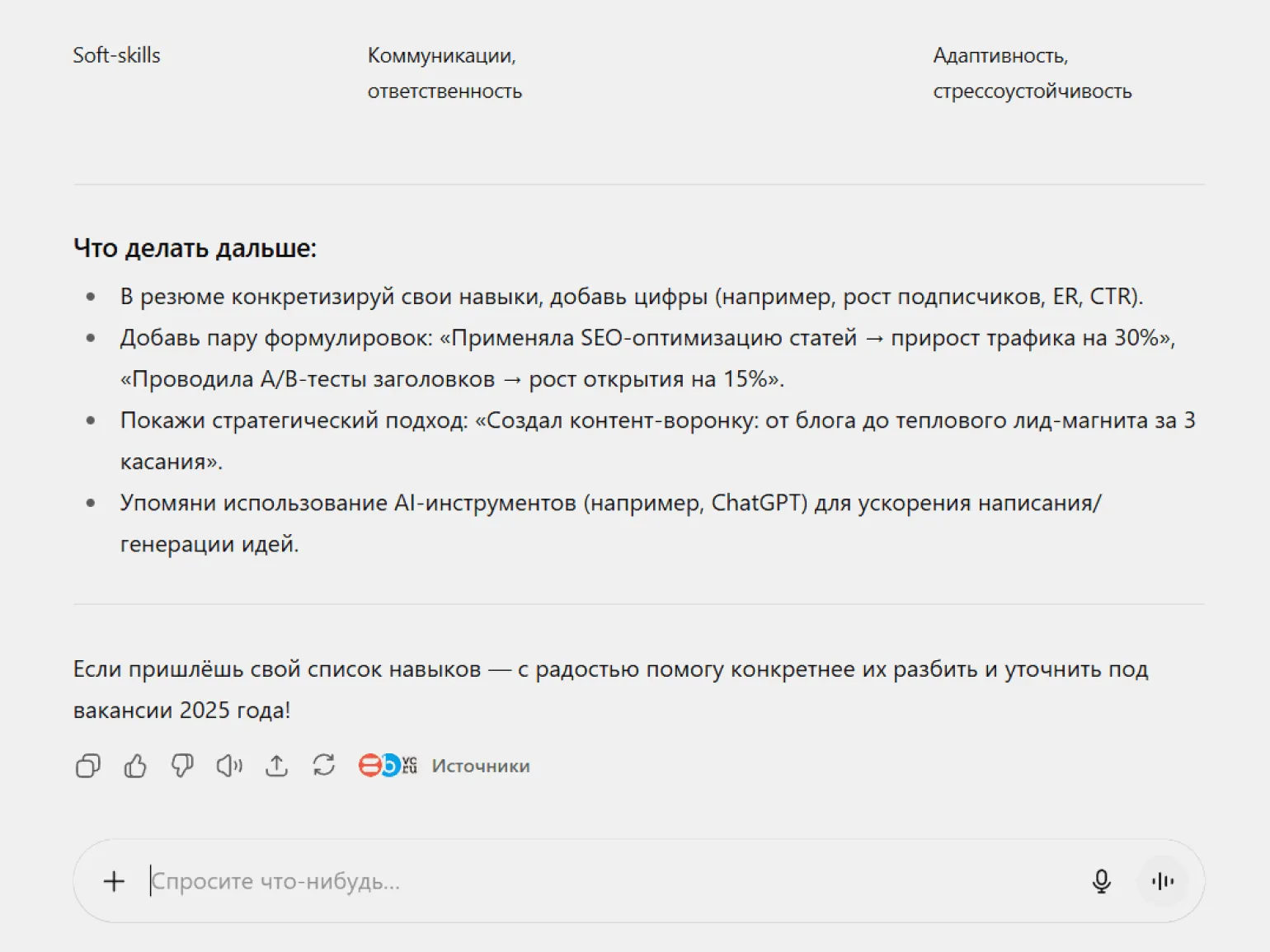 Пример промпта: «Вот список моих навыков. Скажи, какие из них актуальны для вакансии [название должности], какие звучат слишком поверхностно, а чего не хватает, если смотреть на рынок труда 2025 года».