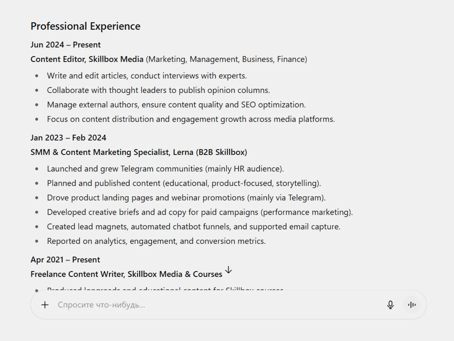 Пример промпта: «Переведи и локализуй моё резюме для вакансий в [страна]. Переведи даты в формат MMM YYYY, валюту — в [€, $]. Добавь ключевые слова из типичных вакансий для роли [название должности]. Сохрани длину».