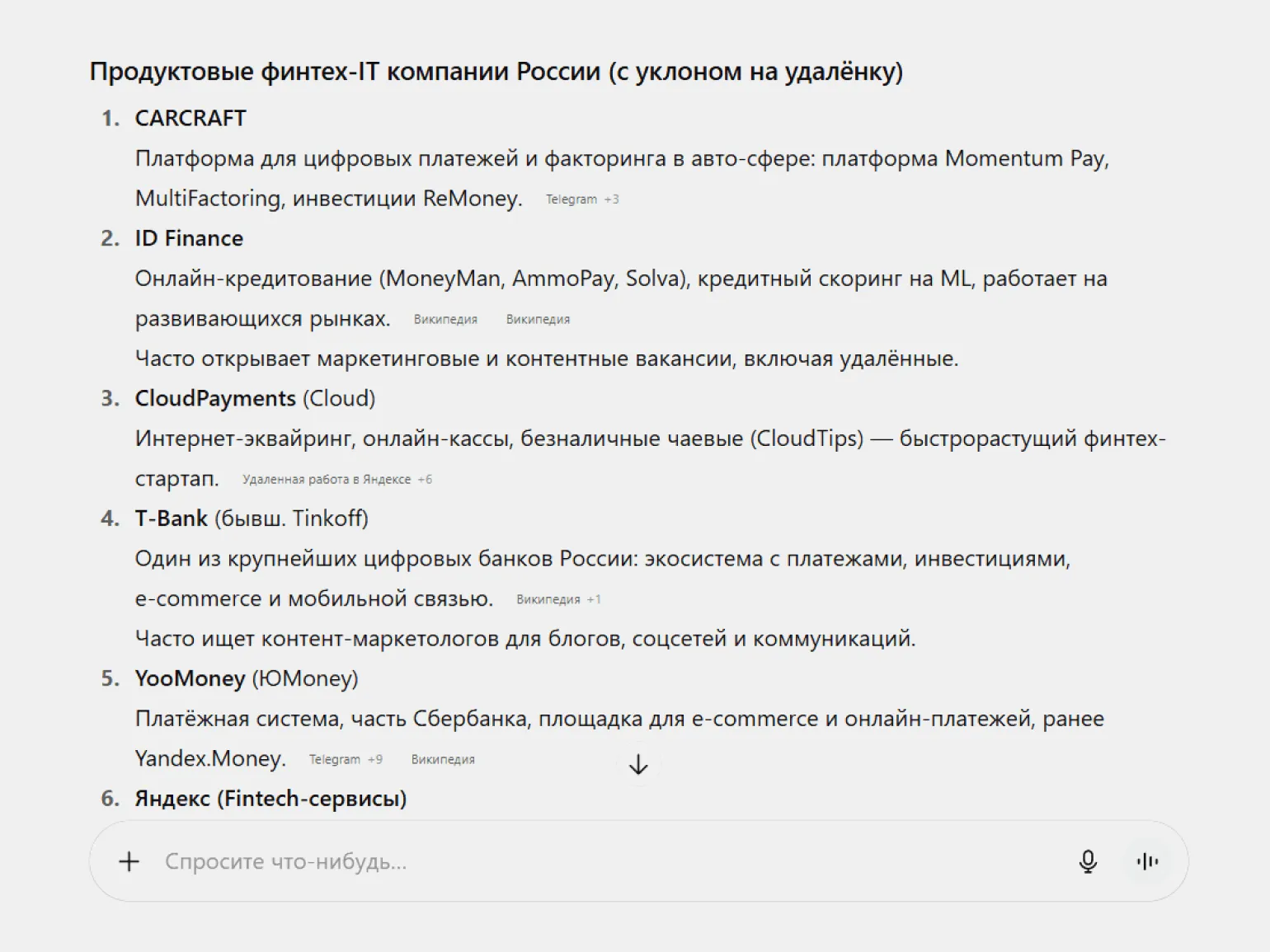 Пример промпта: «Подскажи 20 продуктовых IT-компаний в России, которые развиваются в финтехе и нанимают удалённых специалистов. Добавь для каждой компании краткое описание и отметь, какие из них чаще всего публикуют вакансии на должность [ваша должность]».