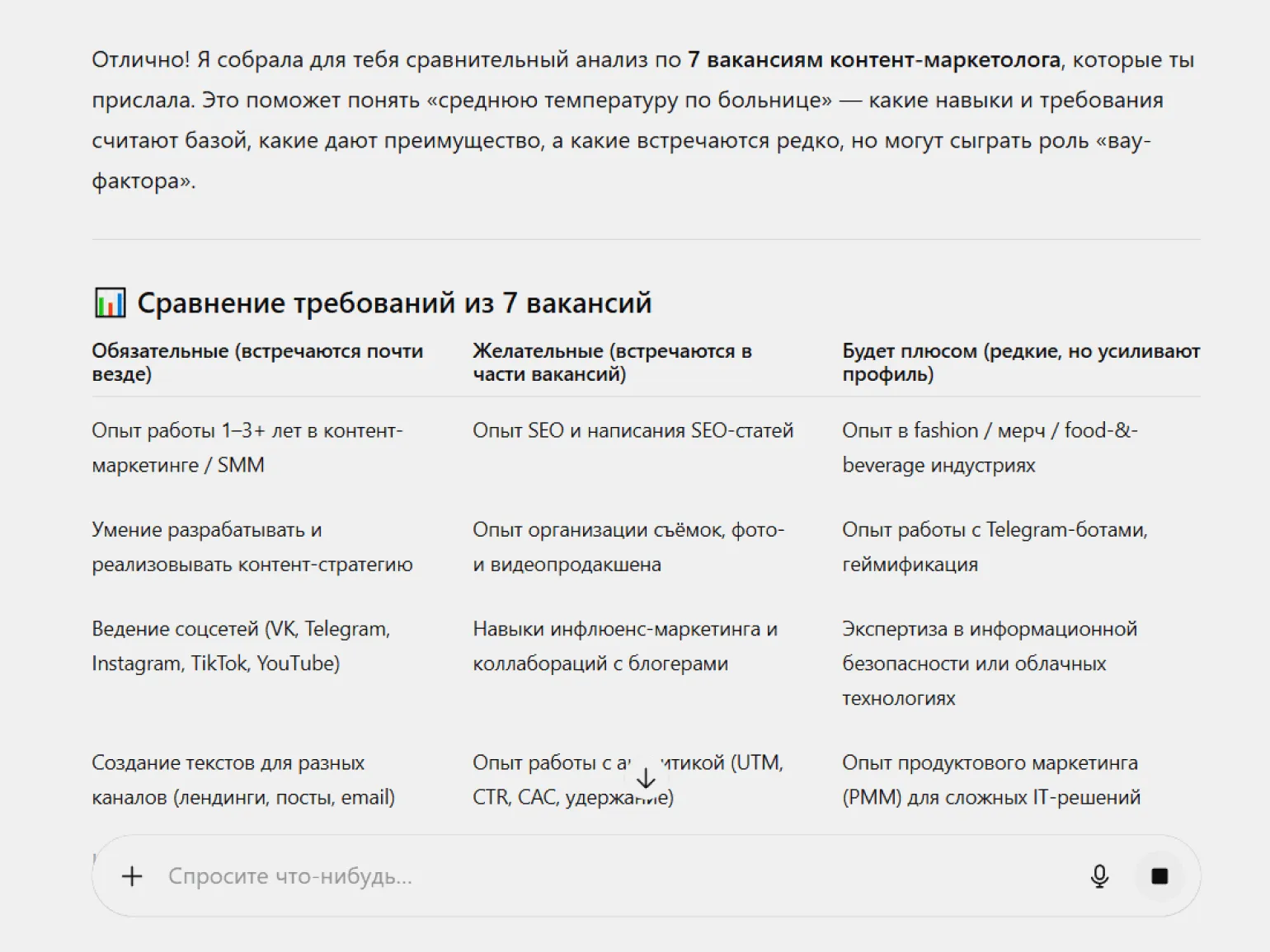 Например, можно загрузить в чат с нейросетью тексты 5–10 вакансий на интересующую должность и попросить сравнить их, сгруппировать навыки и требования по категориям: «обязательные», «желательные» и «будет плюсом».