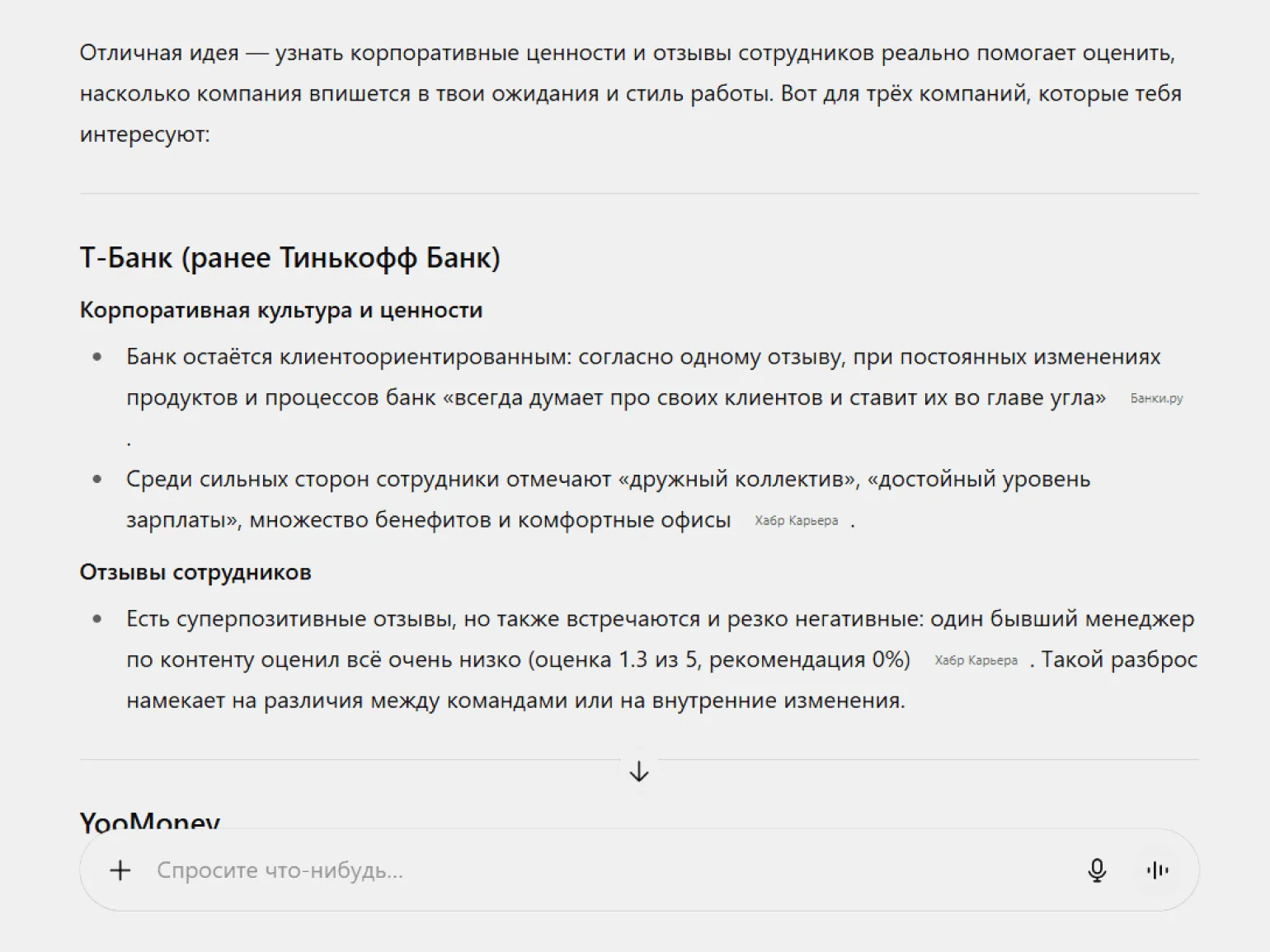 Нейросеть — это зеркало ваших вопросов и формулировок. Если задать ей поверхностный вопрос, то и ответ будет таким же. Поэтому важно не только проверять факты, но и задавать вопросы, которые помогают выявить слабые стороны. Например: «Что здесь плохо?», «Что может насторожить работодателя?», «Какие слабые стороны видны в этом резюме?». Именно так можно получить более честные и полезные ответы.