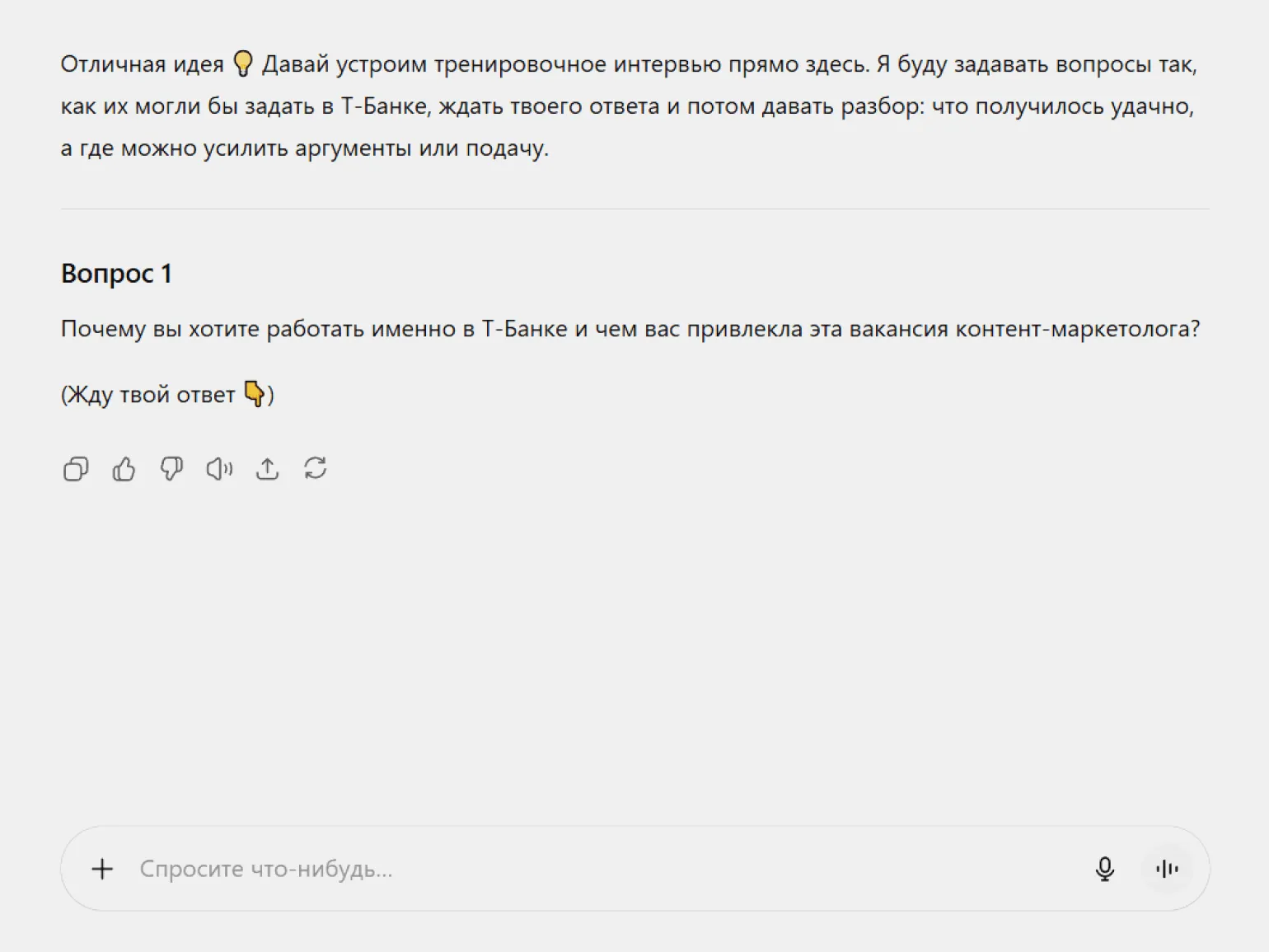 Также можно попросить нейросеть сыграть роль рекрутера. Такой формат имитирует живой диалог. Вы отвечаете на вопросы, а ИИ даёт обратную связь: отмечает, какие ответы звучат убедительно, а какие стоит переформулировать.