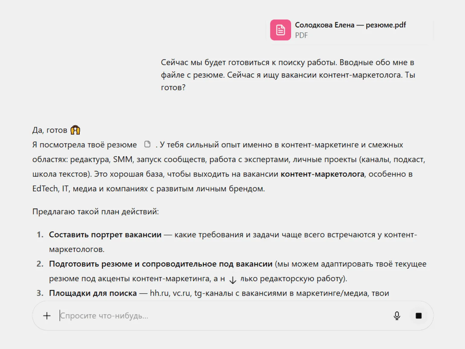 Загрузите файл с резюме или вставьте его текстом, добавьте ссылку на желаемую вакансию или коротко опишите желаемую роль и попросите ИИ: