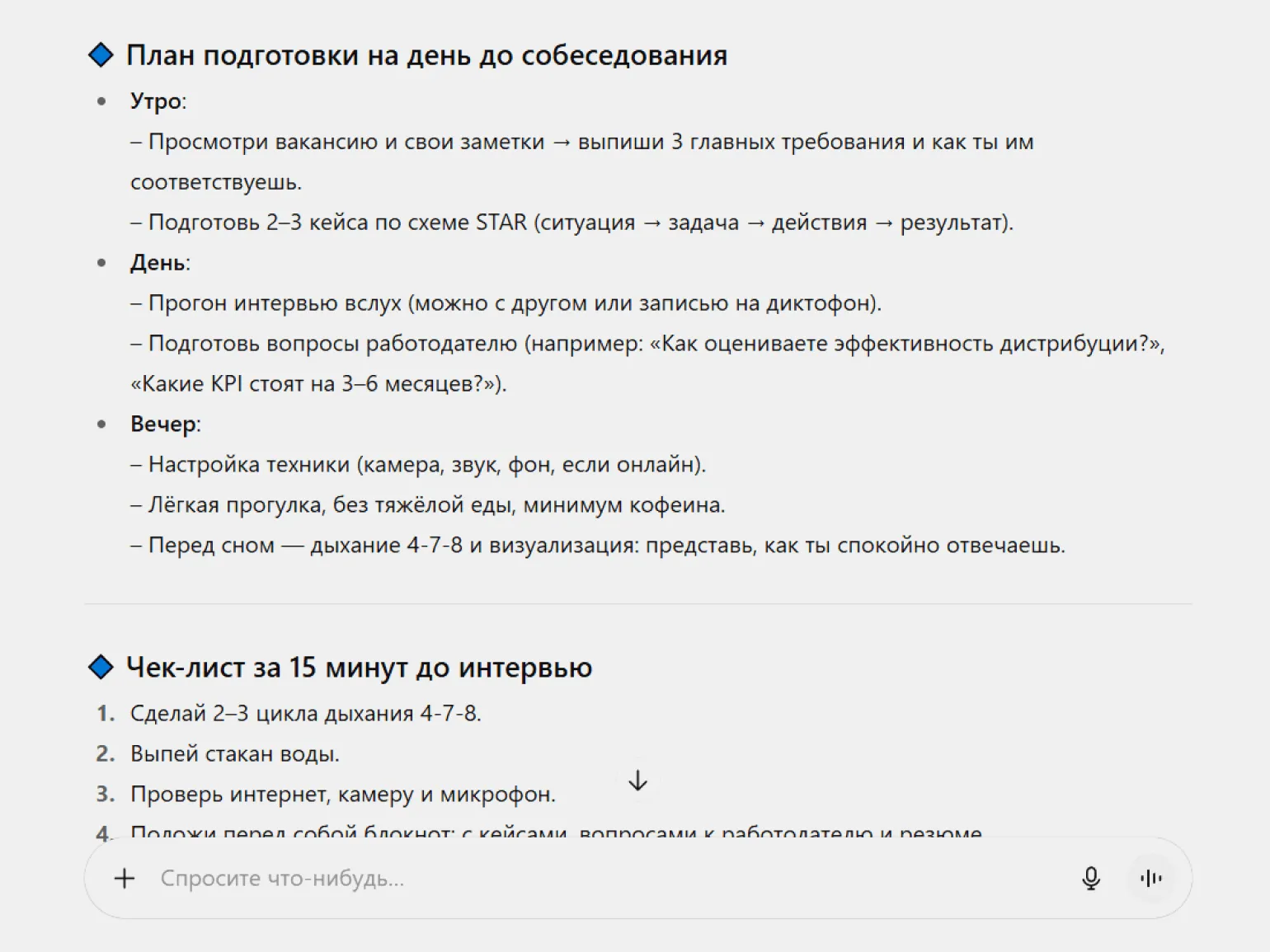 Пример промпта: «У меня скоро собеседование на должность [название]. Подскажи техники для снижения тревожности, которые помогут удержать фокус. Составь план подготовки на день до собеседования и чек-лист действий за 15 минут до интервью, чтобы я чувствовала себя спокойнее и увереннее».