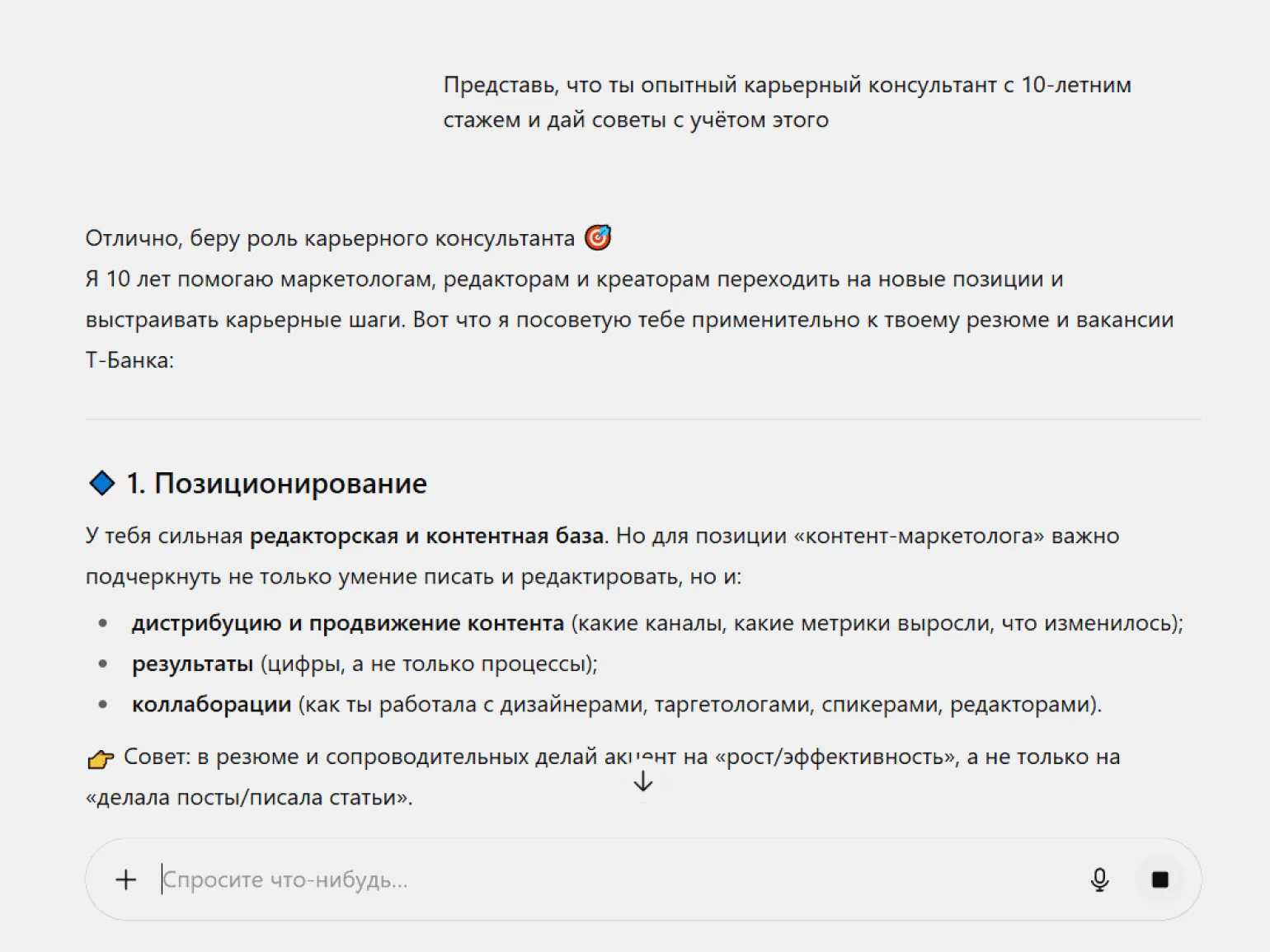 Чтобы рекомендации были полезнее, можно чётко указать роль нейросети в запросе. Например: «Представь, что ты опытный карьерный консультант с 10-летним стажем» или «Представь, что ты нанимающий руководитель в компании X, где я хочу работать». Тогда ответы ИИ будут ближе к тому, как работодатели и рекрутеры оценивают кандидатов в реальности и чего ожидают от их резюме.