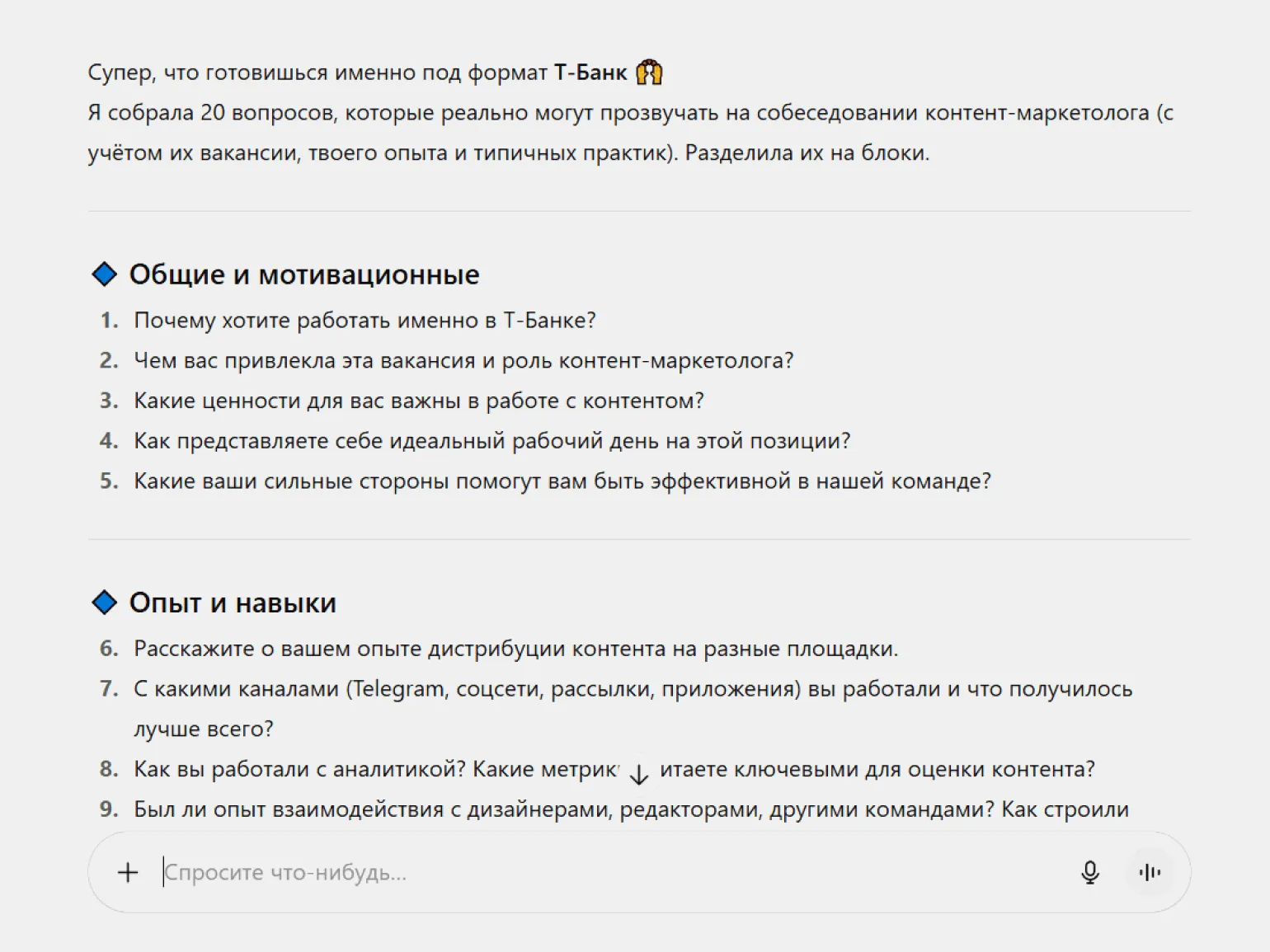 Пример промпта: «У меня собеседование на позицию [название должности] в компании [название]. Вот описание вакансии: [вставьте текст]. Составь список из Х вопросов, которые мне могут задать на собеседовании, — стандартных, про опыт, мотивацию и кейсовых».