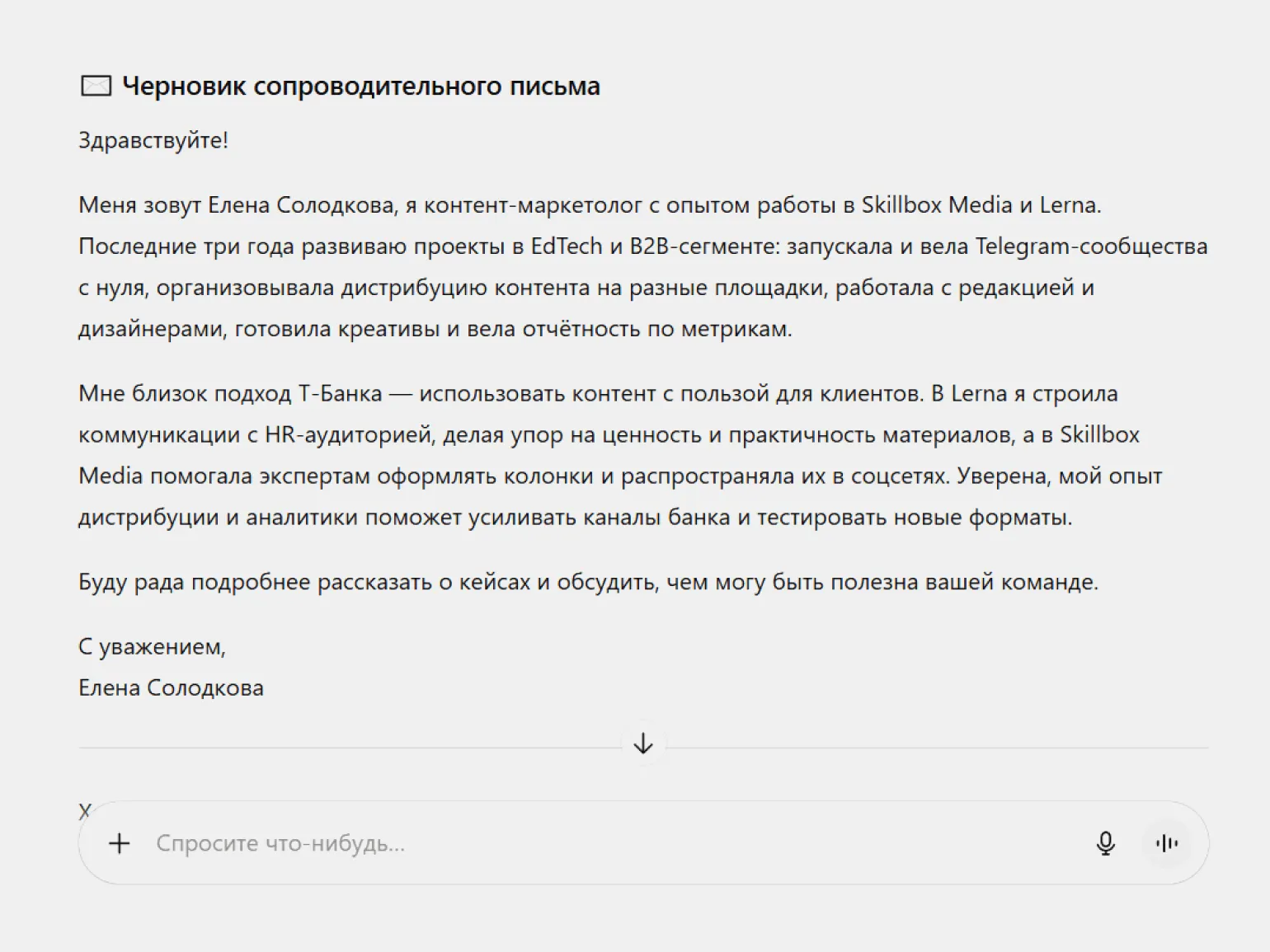 Также можно попросить ИИ сократить письмо до 100–120 слов и сделать его удобным для чтения на экране смартфона. Рекрутеры часто просматривают отклики с телефона, поэтому письмо должно быть лаконичным и разделённым на короткие абзацы.
