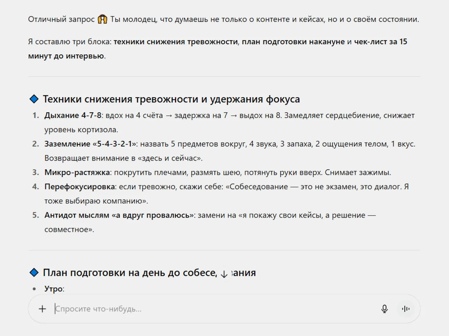 Поддержка перед собеседованием. Нейросеть может подсказать техники для снижения тревожности — например, дыхательные упражнения, простые методы концентрации или короткие фразы-якоря, которые помогут держать фокус. Это поможет прийти на интервью более спокойным, снизить градус волнения и показать себя с лучшей стороны.