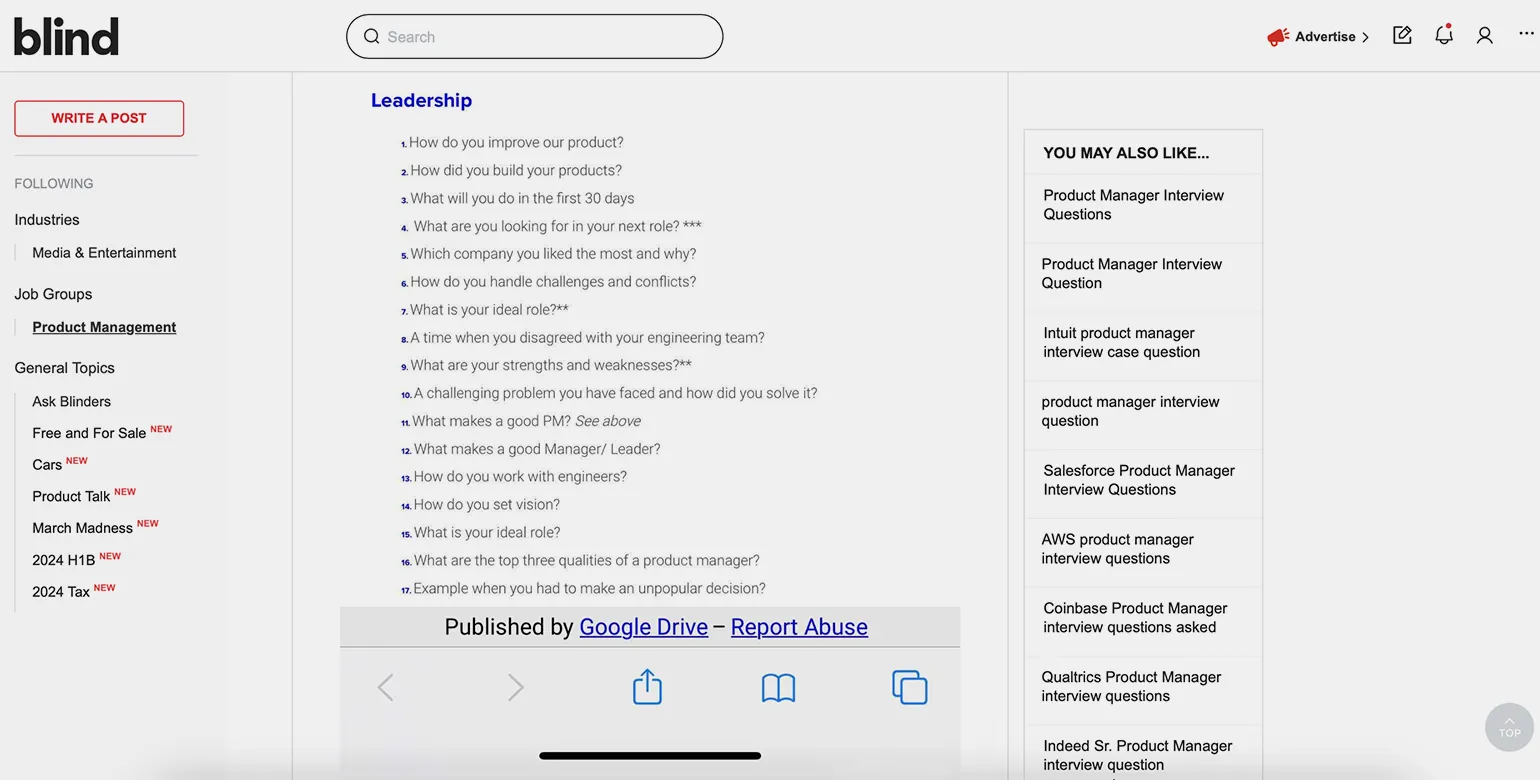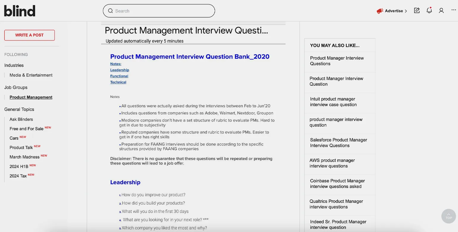 Например, есть платформа Blind. На ней люди делятся своим опытом прохождения интервью и рассказывают про опыт собеседований в компаниях. А на платформе Exponent есть курсы по прохождению интервью в конкретных компаниях.