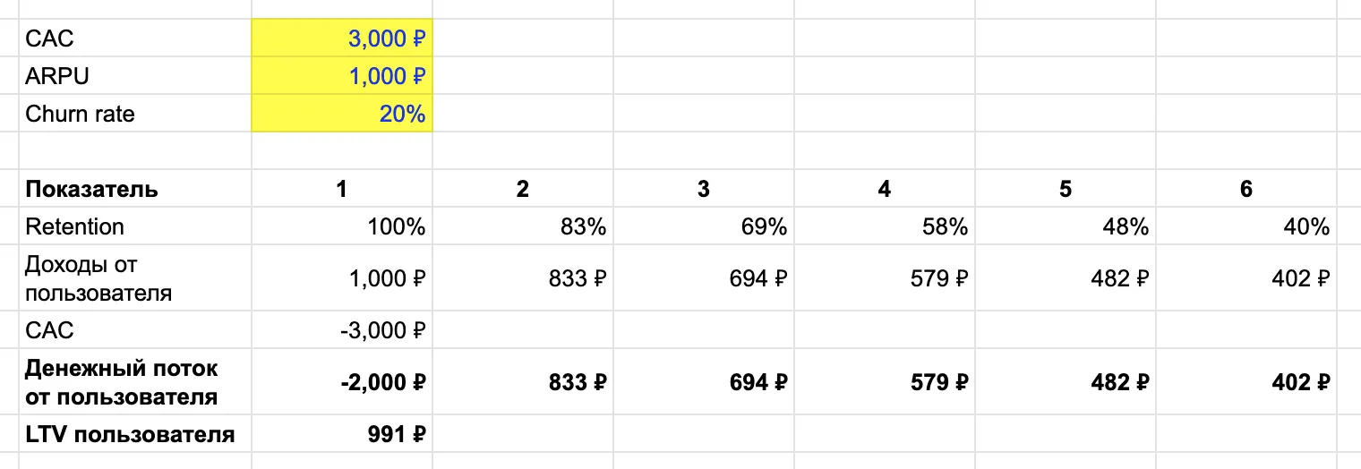 Привлечение подписчика стоит 3000 рублей. Вероятность, что он останется нашим клиентом на второй месяц, составляет 80%, на третий — 0,8 * 0,8 * 100% = 64%, и так далее. Средний месячный чек — 1000 рублей. Такой подписчик принесёт нам 3991 рублей за 6 месяцев, что на 991 рубль превышает CAC.