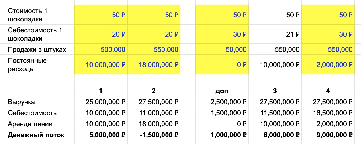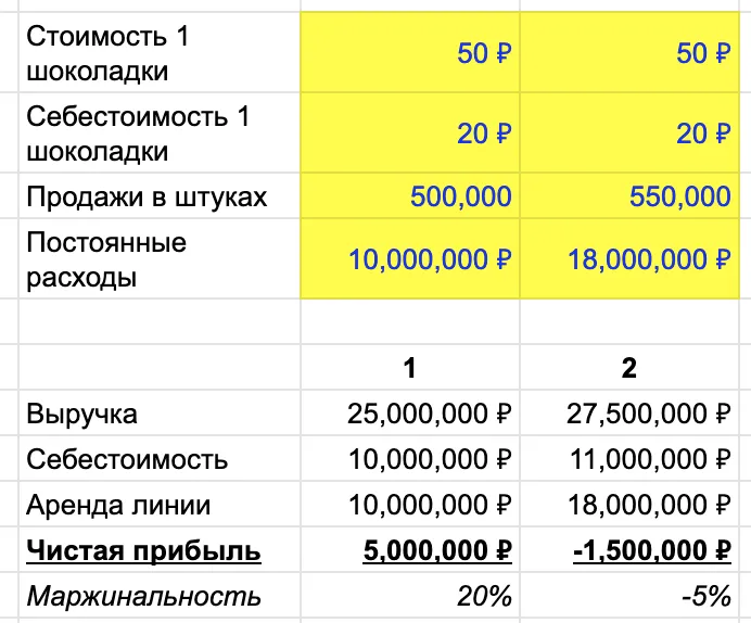 Представьте, что вы производите шоколадки. Цена реализации одной штуки — 50 рублей, себестоимость — 20 рублей, объём продаж — 500 000 штук в месяц, затраты на аренду производственной линии — 10 000 000 рублей. Чистая прибыль — 5 000 000 рублей в месяц.