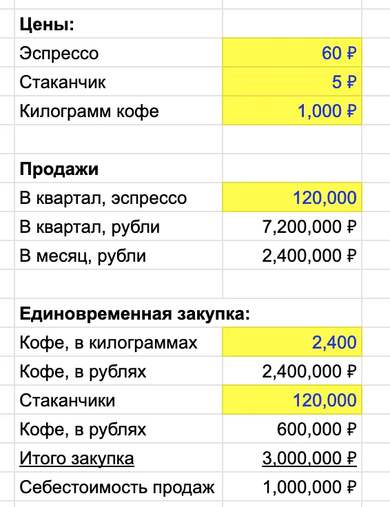 Рассмотрим сеть кофеен, которая, для простоты, продаёт один только эспрессо, 100 тыс. стаканчиков в квартал. Для этого объёма требуется 2000 кг кофе и, собственно, 100 тыс. стаканчиков.