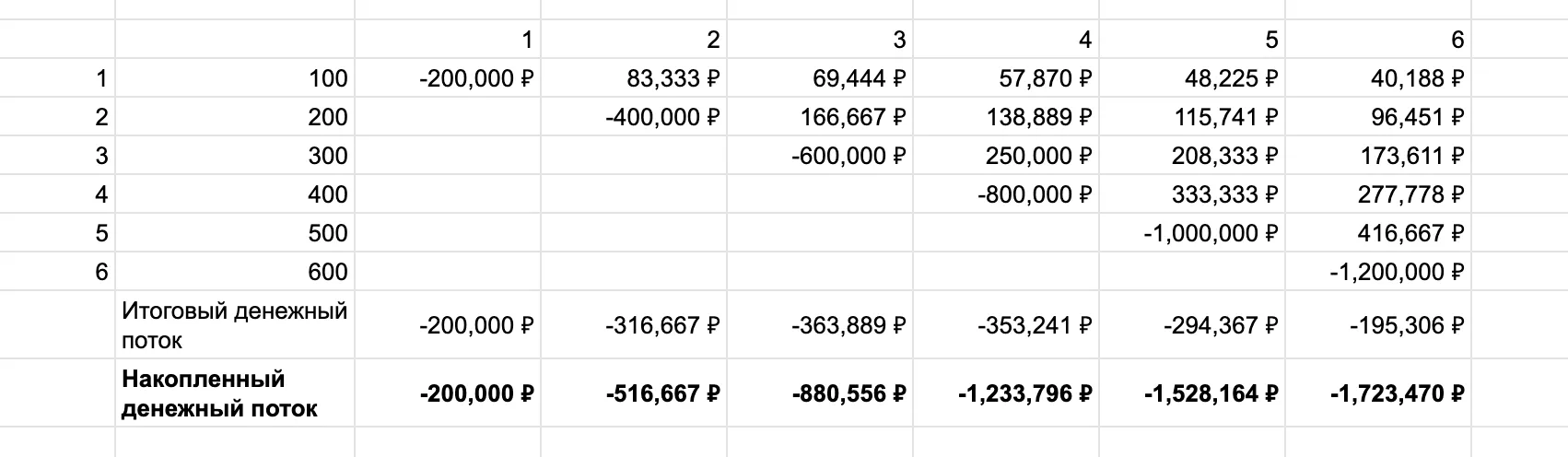 Предположим, маркетологи привлекают 100 пользователей в первый месяц, 200 во второй, 300 в третий и так далее, вплоть до шестого. Месячный денежный поток по проекту в первый месяц составит минус 200 000 рублей, во второй — минус 316 667 рублей и в третий — минус 363 889 рублей.