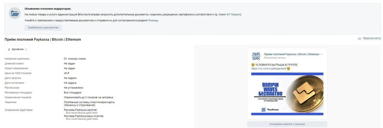 Например, для запуска рекламы одного конкурса у нас уходит около недели. После сорока отказов объявления с разными настройками, его могут вдруг согласовать. Не исключено, что наши объявления попадаются модератору-криптоэнтузиасту.