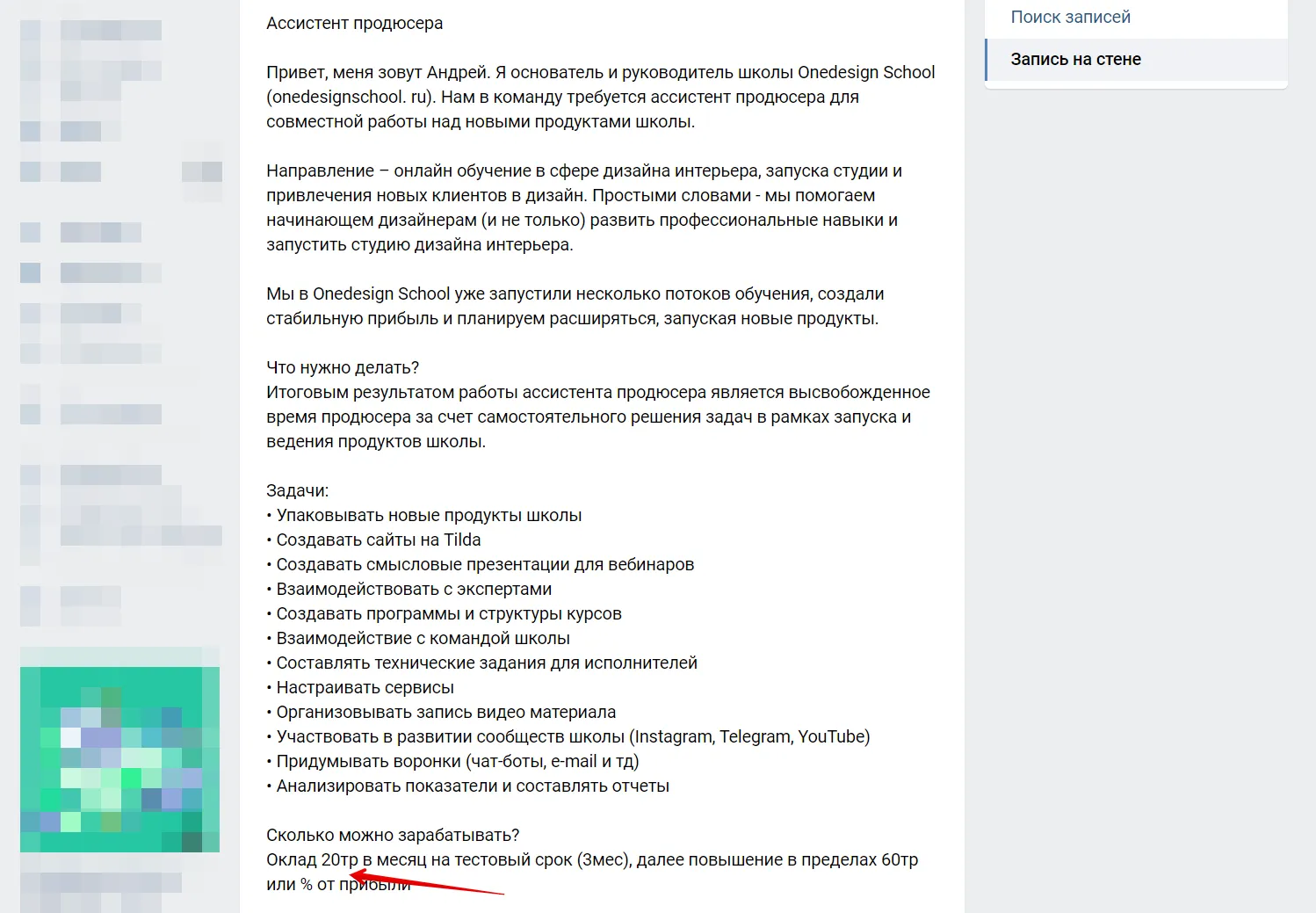 Ассистент руководителя в школу дизайна интерьера. Старт с 20 тысяч рублей в месяц с перспективой в конце испытательного срока получать 60 тысяч. Можно без опыта в онлайн-образовании, но с навыками создания сайтов, разработки ТЗ, работы с презентациями и других.