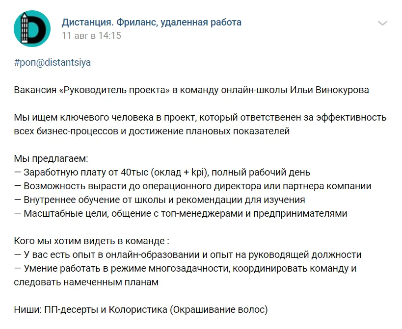 Пример вакансии для менеджера онлайн-курсов по приготовлению полезных десертов