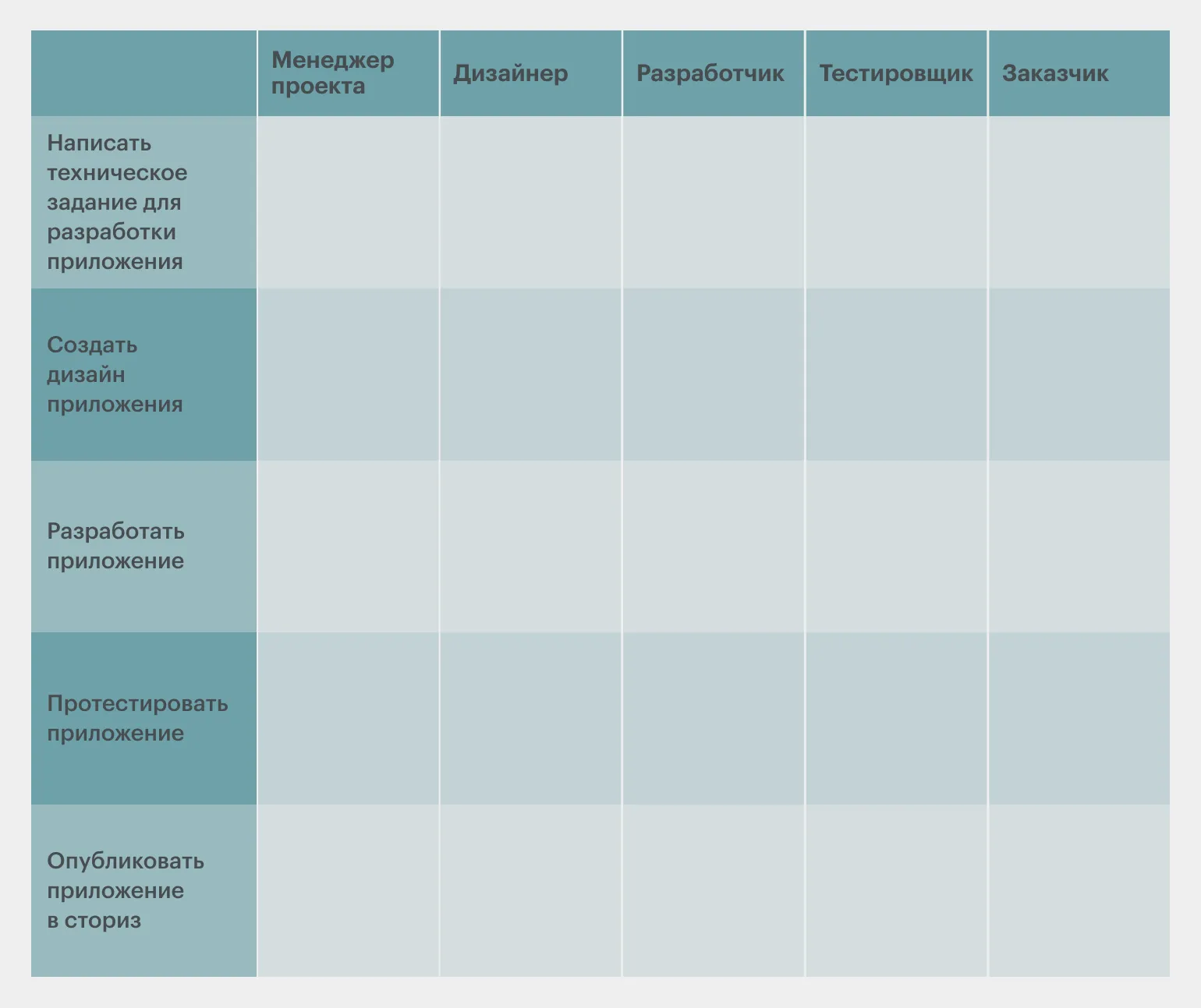 Разберём процесс построения матрицы RACI пошагово, на примере разработки приложения для телефонов.